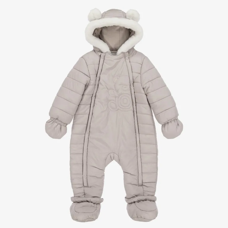 Adorable beige quilted snowsuit for baby boys and girls from Spanish brand, Mayoral. Silky smooth and warmly padded, it has a soft and comfortable cotton jersey lining and a useful double front zip fastening. For added protection, the neck opening secures with a popper, the cuffs are elasticated and smaller sizes come with detachable mittens and booties. To complete the cute look, there is an embroidered teddy design on the front, with faux fur trim and 3D ears on the hood.