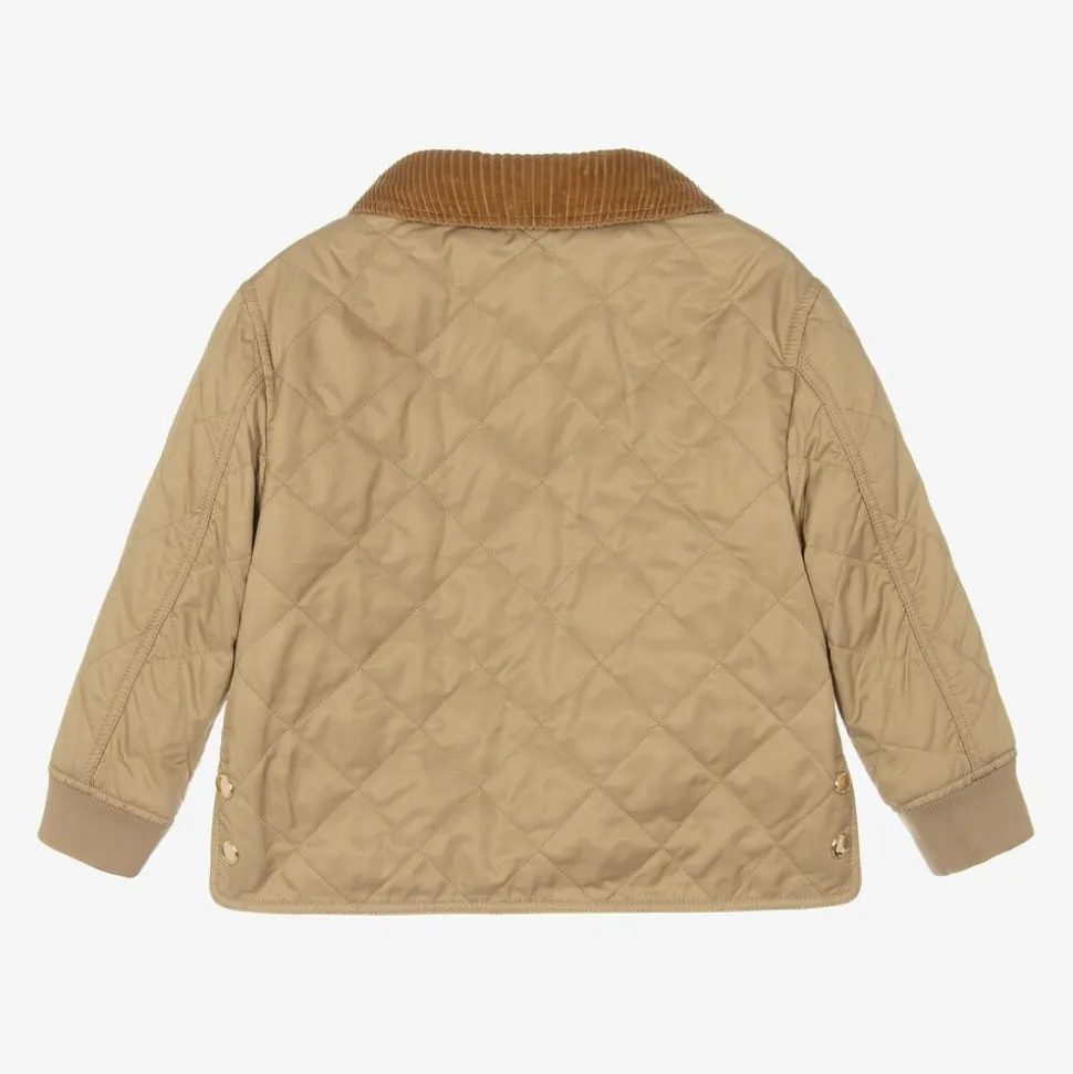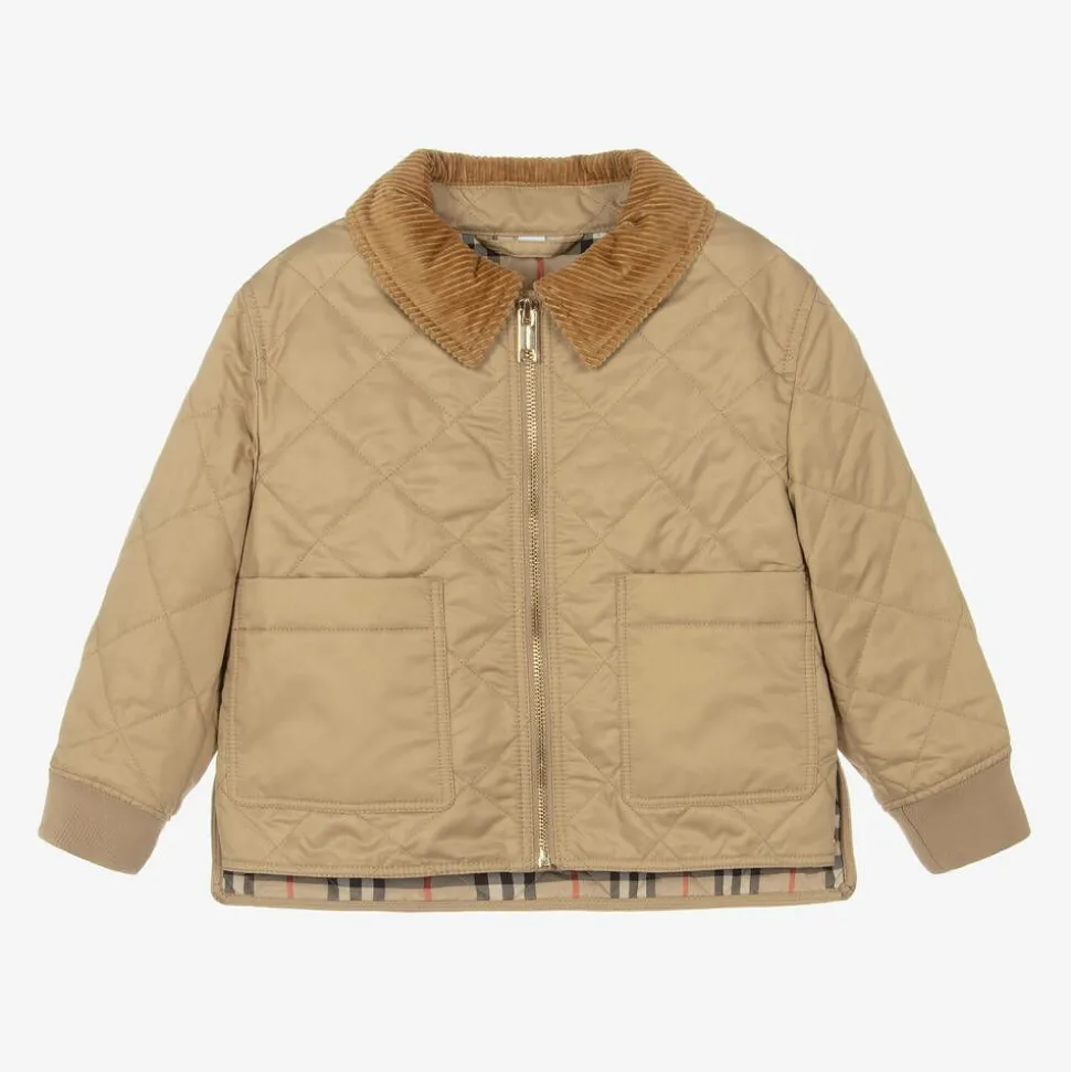A diamond quilted jacket in Archive beige for boys and girls by luxury British brand Burberry. Silky smooth and lightweight, it is lined in the Burberry Check for a classic signature look. This traditional style has a corduroy collar, soft ribbed cuffs and patch pockets on the front. It zips up with a shiny golden puller and there are popper fastenings on the side vents, subtly branded for an added luxury finishing touch. The main material of this product is made with at least 70% recycled content.