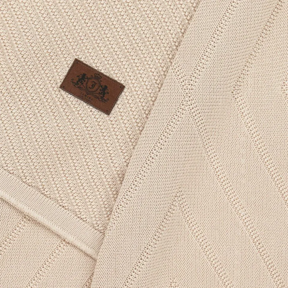 Beige blanket for baby boys and girls by Jamiks, made in super soft viscose. Knitted with a geometric, striped pattern, it is ideal for use in the cot or when out and about in the pram or car seat. It has a brown, eco-leather logo badge sewn on one side.