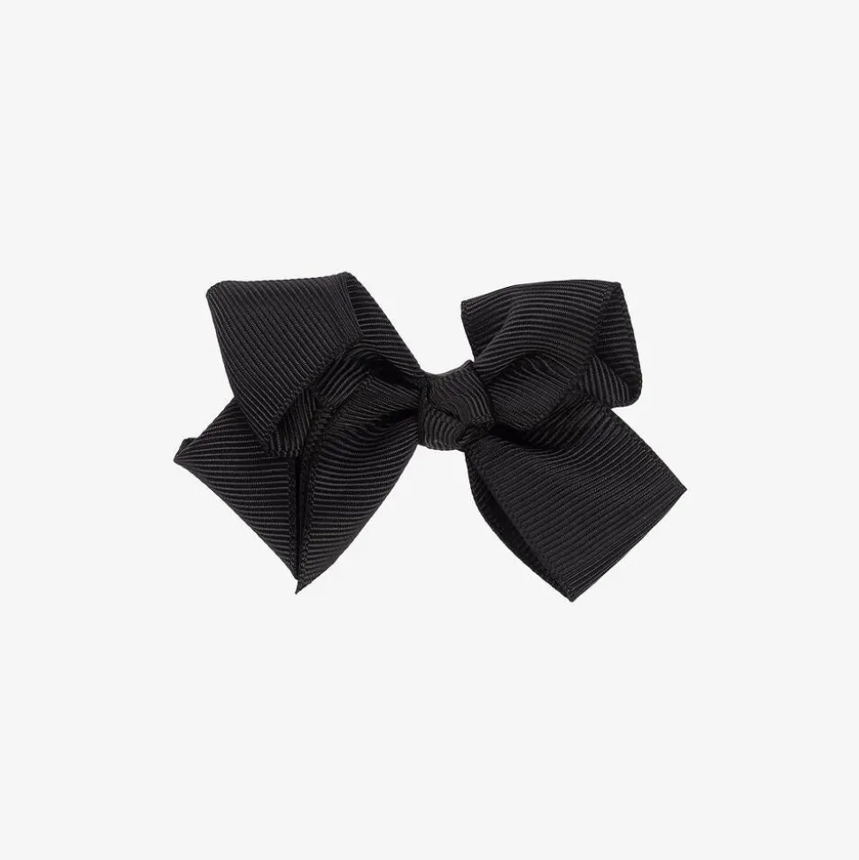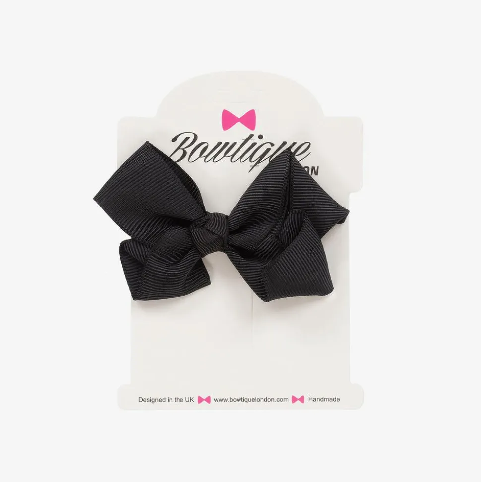 Sweet black bow hair clip for girls from Bowtique London. A lovely accessory to complete an outfit, it is handmade in soft grosgrain ribbon and set on a slide-in metal clip.