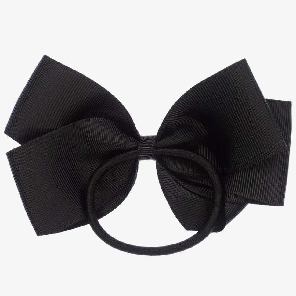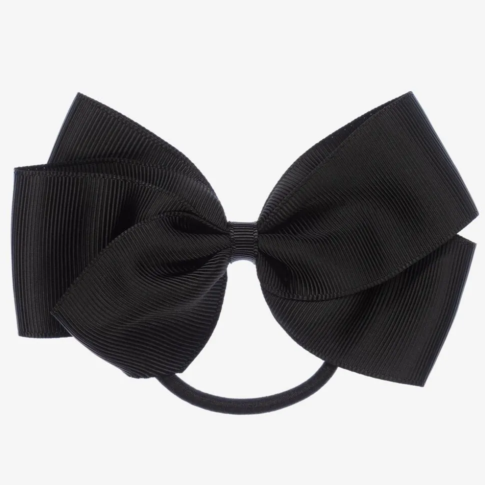 Black hair elastic for girls from Peach Ribbons. Lovely to complete an outfit, this pretty accessory has a large handmade grosgrain ribbon bow detail.