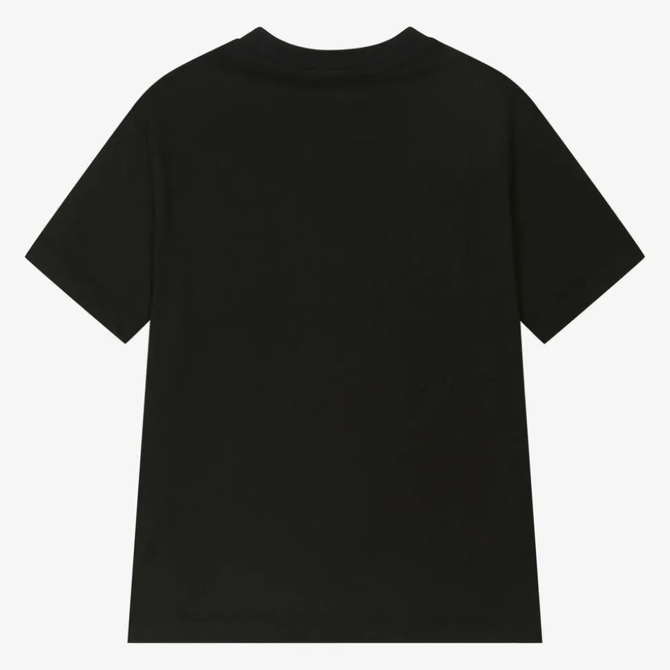 Black short-sleeved T-shirt for boys and girls by Italian brand MSGM, made in soft cotton jersey. This casual wardrobe staple is designed with a relaxed fit and a ribbed crew neck. For instant designer appeal, it is printed on the chest with the label's distinctive brushstroke logo in white.