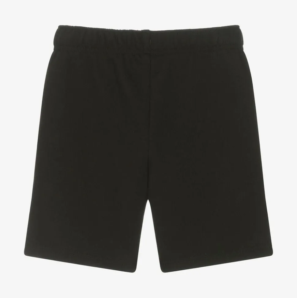 Black jersey shorts for boys by Lacoste, made in a soft blend of organic cotton and recycled materials. With a soft fleecy inside, they have concealed side seam pockets and an inner drawstring for adjustable comfort. The brand's crocodile logo can be seen on the leg, completing the casual style with a touch of branding.