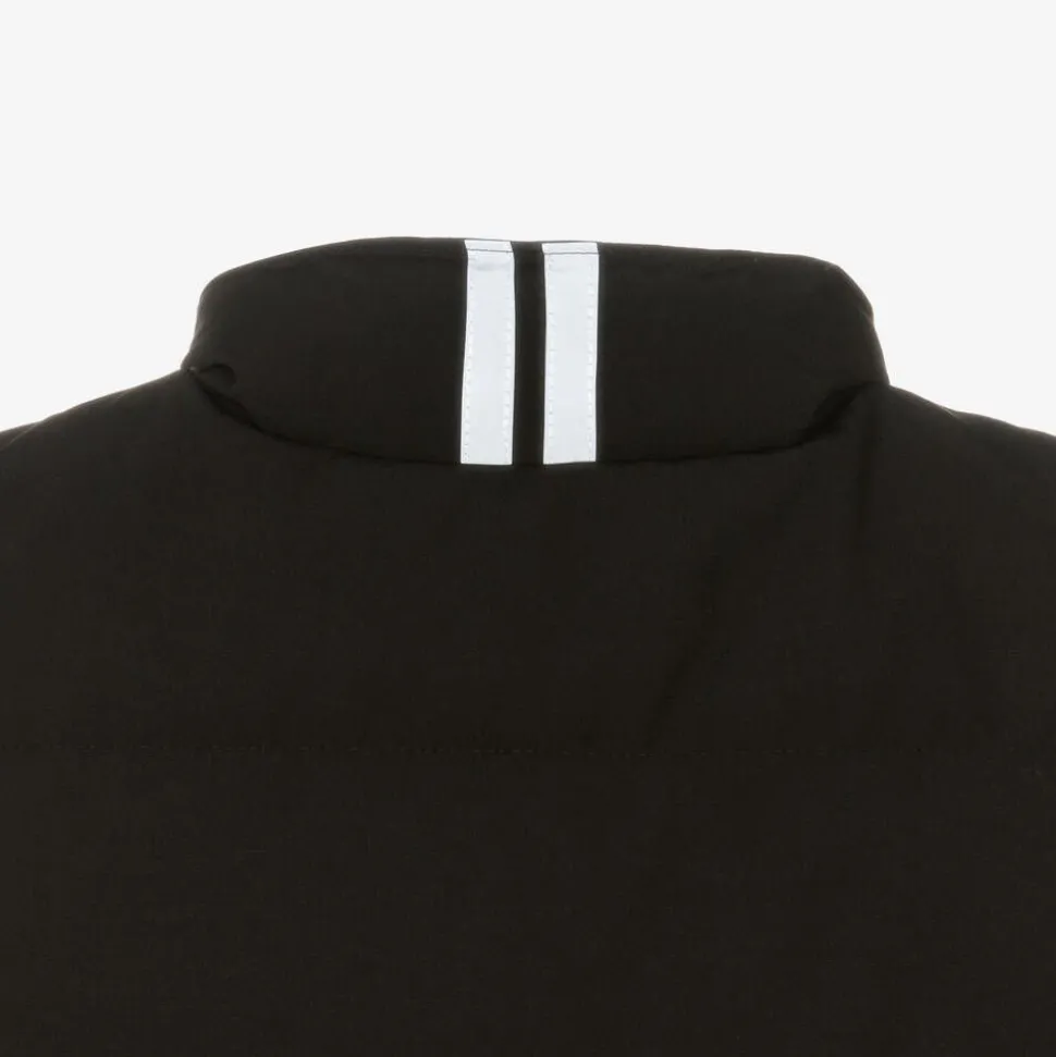 Black gilet for boys and girls by luxury designer Canada Goose, with the iconic disc logo on the chest. Ideal for layering, this durable gilet is made from water-repellent, recycled, organic ARCTIC TECH fabric with luxurious down padding. The hem is longer at the back for protective coverage and there are reflective stripes on the back of the padded collar for low-light visibility. The two fleece-lined popper pockets on the front are designed to warm hands and the front zip fastening is concealed under a popper-fastening placket to shield your child from the elements.