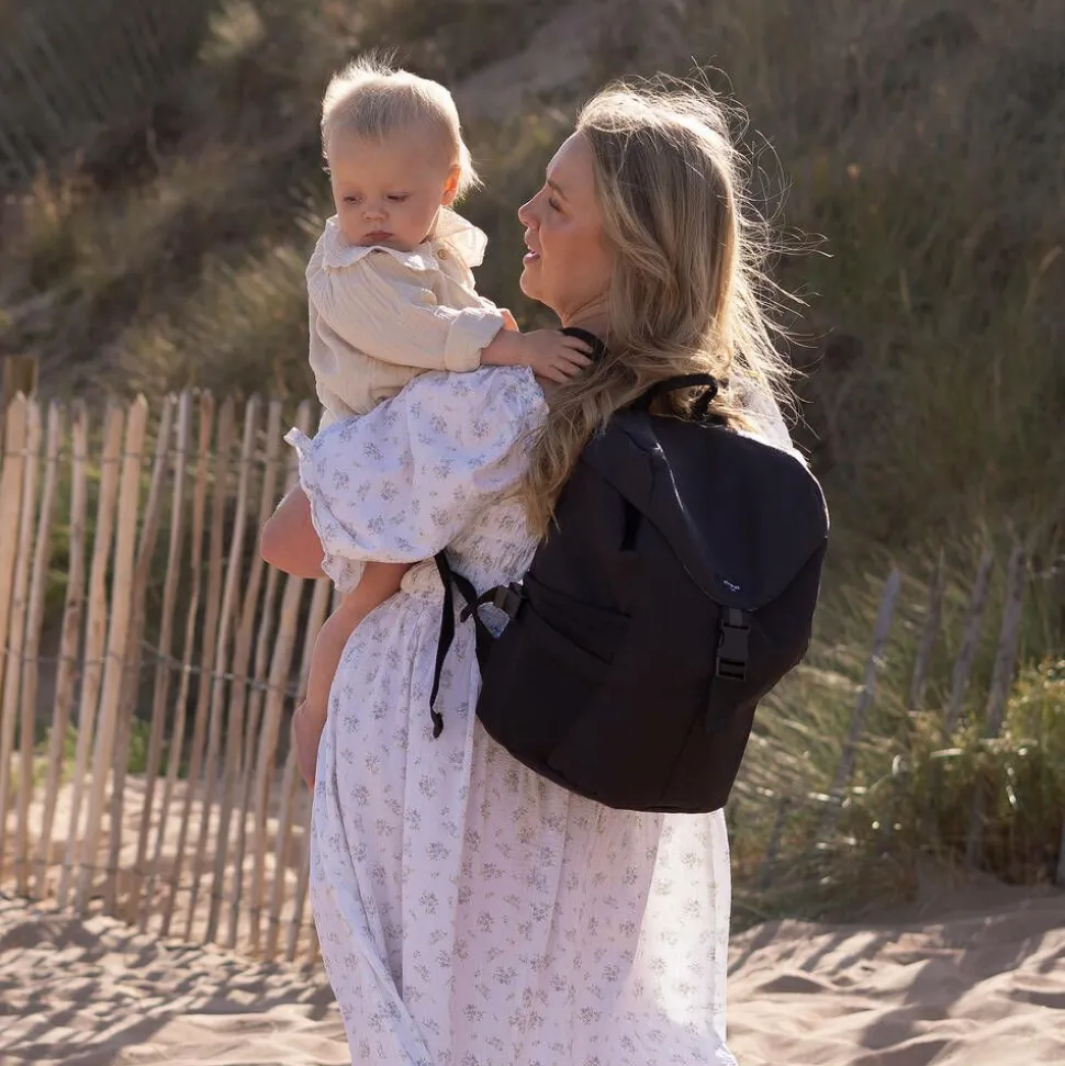 Black eco changing backpack by Storksak, made using recycled materials from plastic bottle waste. The spacious main compartment contains elasticated and slip storage pouches for extra organisation, and can be closed with an easy-to-use toggle. It comes with an easy-to-clean changing mat for changing baby on-the-go and two insulated pouches for storing baby bottles and food. The padded shoulder straps are adjustable for a great fit. There is a zip fastening pouch on the front for smaller essentials, and the main flap fastens with an all-black buckle on the front.