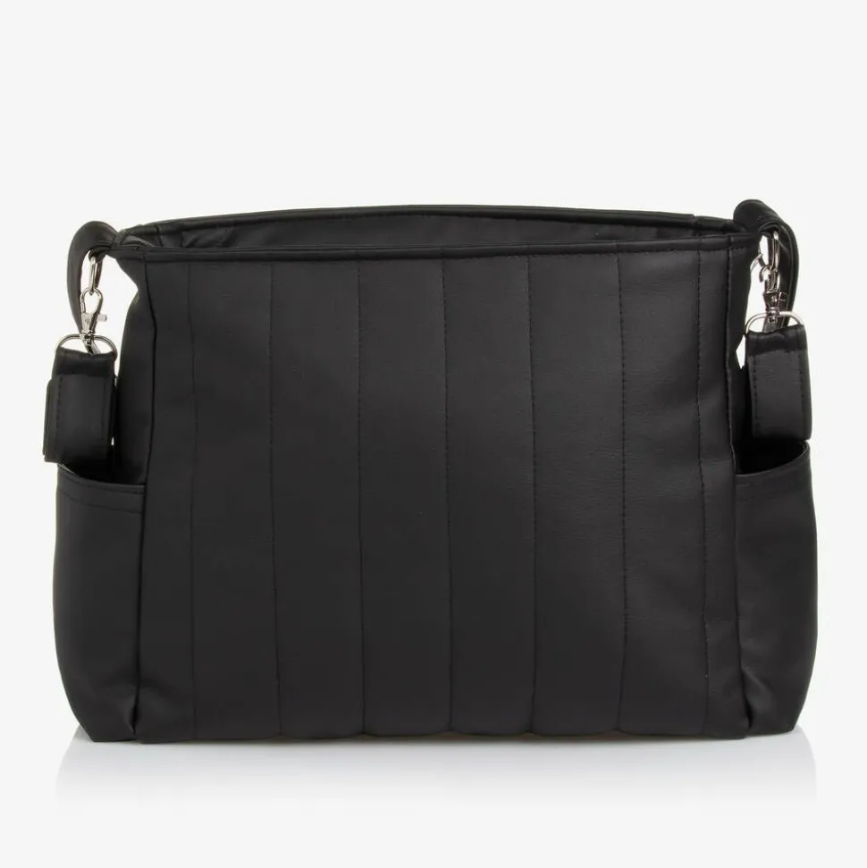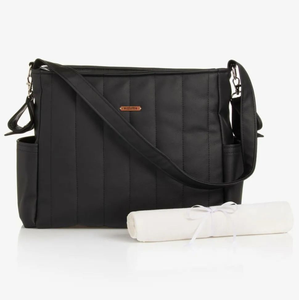 Stylish black faux leather baby changing bag by Uzturre, fastening with a secure zip. The front is decorated by a brown faux leather logo badge and it has subtle stitching for a quilted effect. The spacious main compartment has internal pouches and elasticated trims, helping to organise belongings. There are pouches pockets on each side for baby bottles and other small essentials. It has a useful fixed shoulder strap and small stroller straps on each side, fastening with velcro. It comes with a towelling changing mat for changing your little one on-the-go.