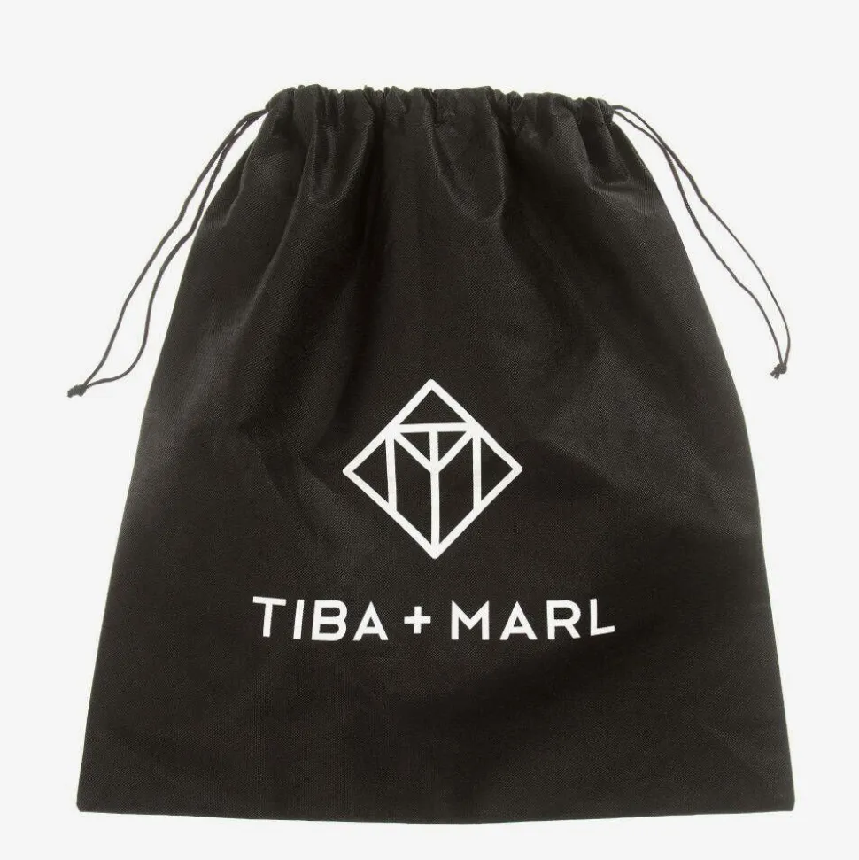 Black changing bag by TIBA & MARL, made in soft quilted faux leather. The main compartment has an internal pocket and an insulated bottle holder. It fastens with a popper on an internal strap and a popper on the flap. There are multiple external pockets, attached stroller straps and a detachable, adjustable shoulder or cross-body strap. This compact bag has a silver metal logo on the front and comes with a padded changing mat.