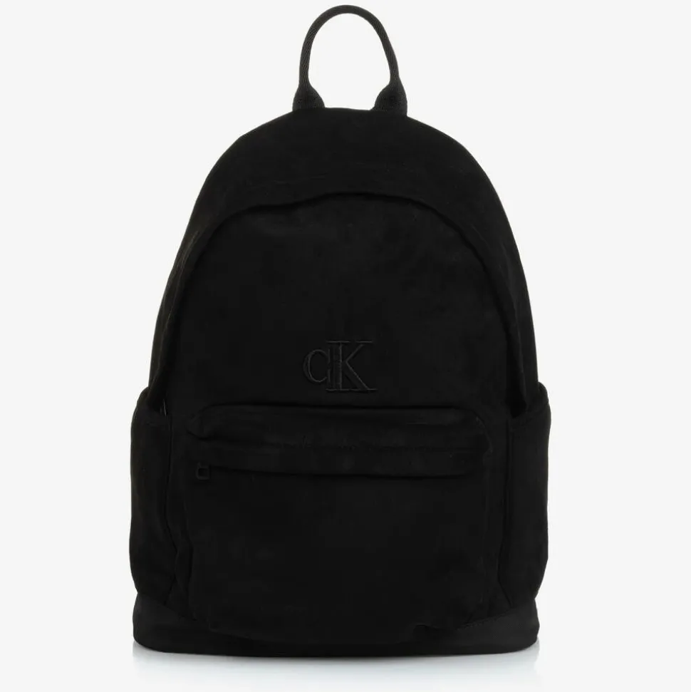 Sleek black backpack for boys and girls from Calvin Klein, made from soft faux suede leather. With two large zip-fastening pockets, this cool bag is ideal for school or play.