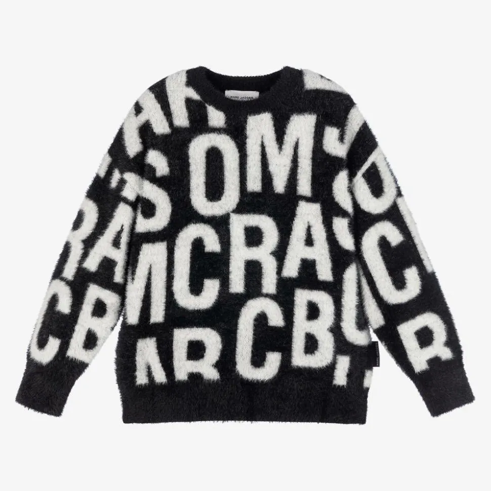 Soft and fluffy, black knitted sweater for boys and girls by MARC JACOBS. It is patterned in the designer's white jumbled logo for a statement look. This cosy jumper has ribbed trims and long sleeves, with a branded tab at the side seam.