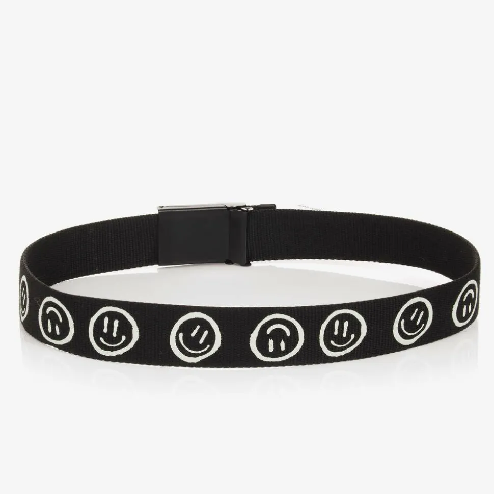 A black woven belt for boys and girls by Molo. It is printed with white happy faces for a fun look, and has a black clasp fastening on the front for an adjustable fit.