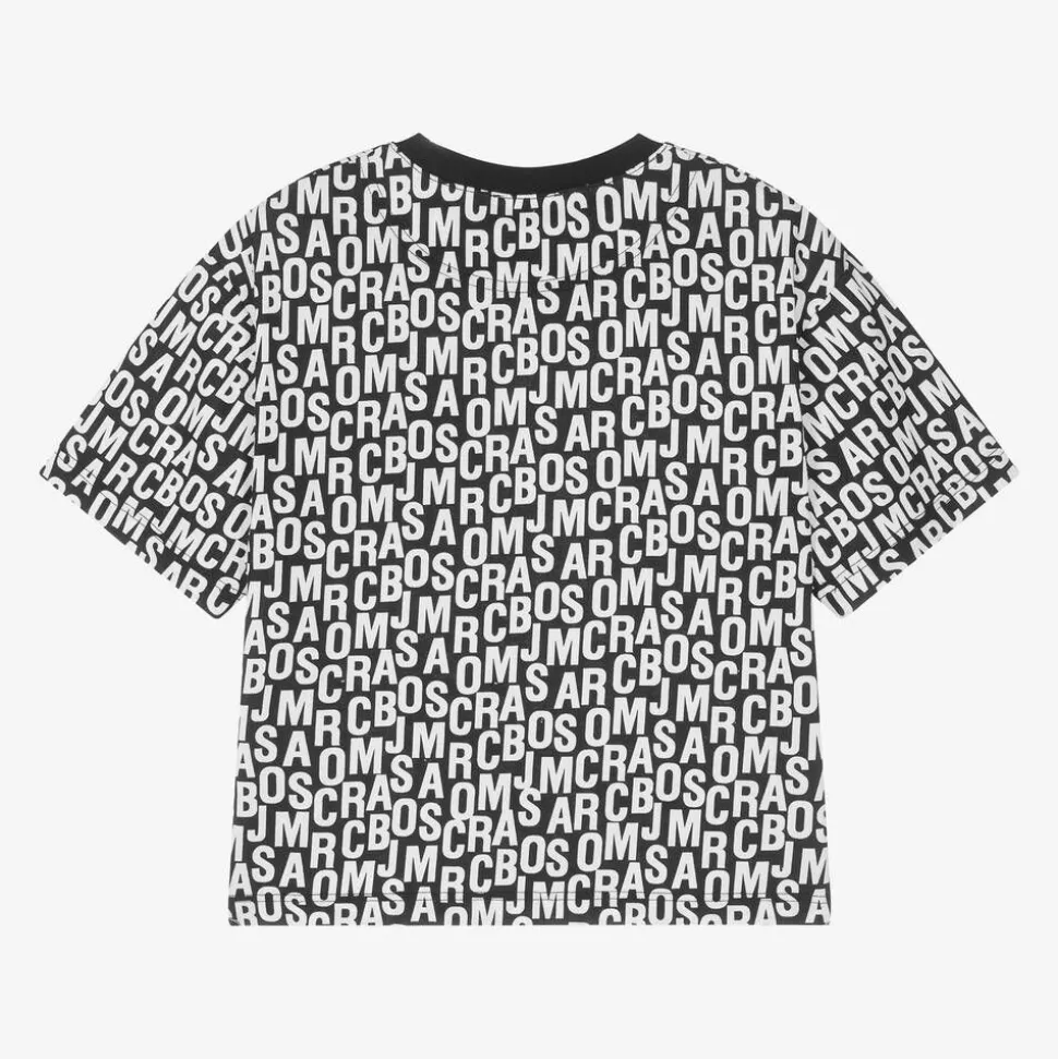 Unmistakably MARC JACOBS, a black and white T-shirt for boys and girls, patterned in the designer's distinctive Jumbled logo. Made in soft organic cotton jersey, it has a ribbed crew neck and a branded black chest pocket.