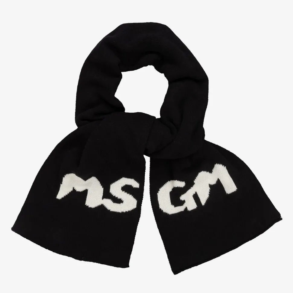 A stylish black and ivory cotton knit scarf for boys and girls from Italian brand, MSGM. It is made in a soft and cosy double layer with half of the logo lettering knitted on each end.