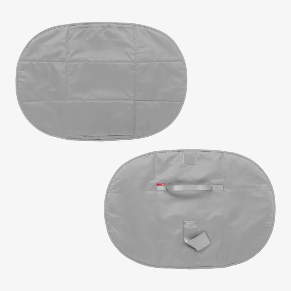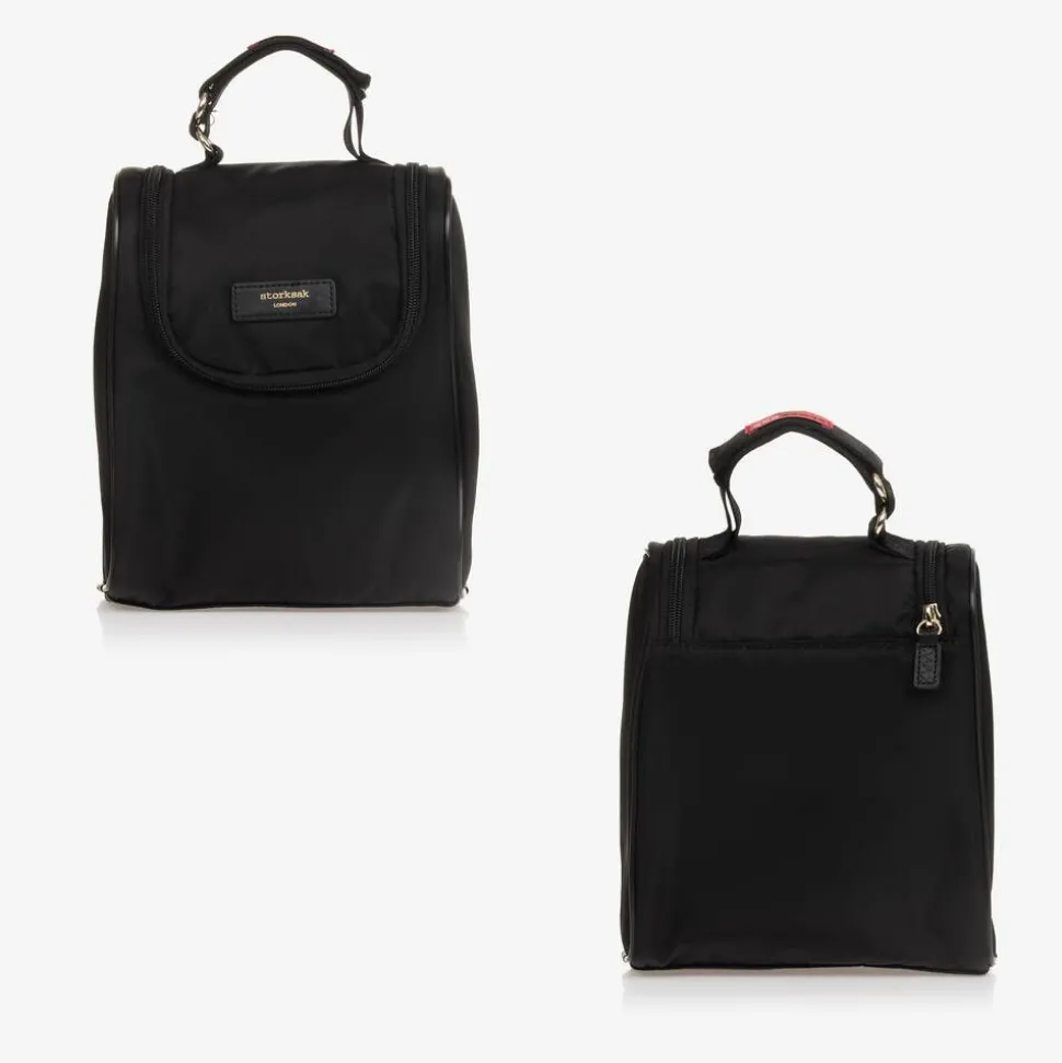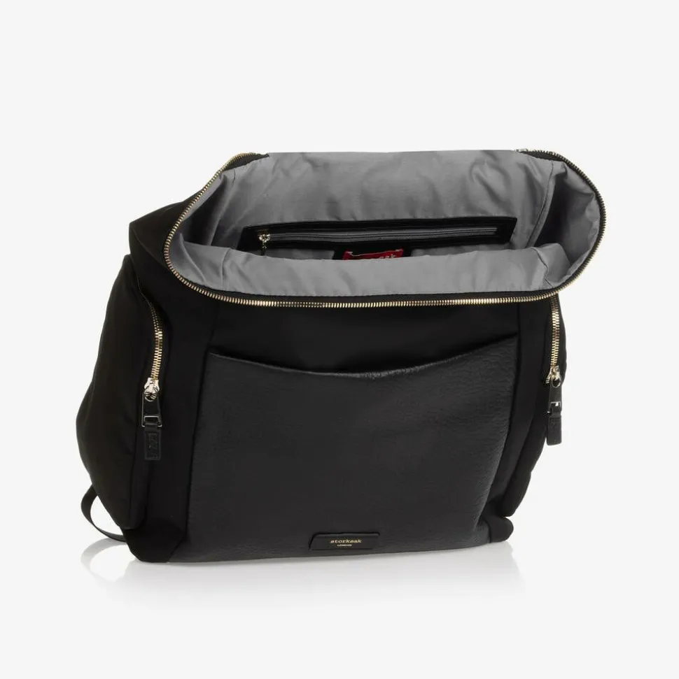 Practical black changing bag by Storksak, with stylish gold accents and grained leather trims. The spacious main compartment fastens with a smooth zip, and contains elasticated and zip pouches for extra organisation. It comes with an easy-to-clean changing mat and useful bottle bag, each with velcro fastening carry straps. There are zip-fastening pouches on the sides and a slip, popper-fastening pocket on the front and back for smaller essentials. The adjustable, shoulder straps can transform into stroller straps, via the gold clip fastening on the back. A gold embossed logo can be seen on the front, completing this accessory with a branded touch.