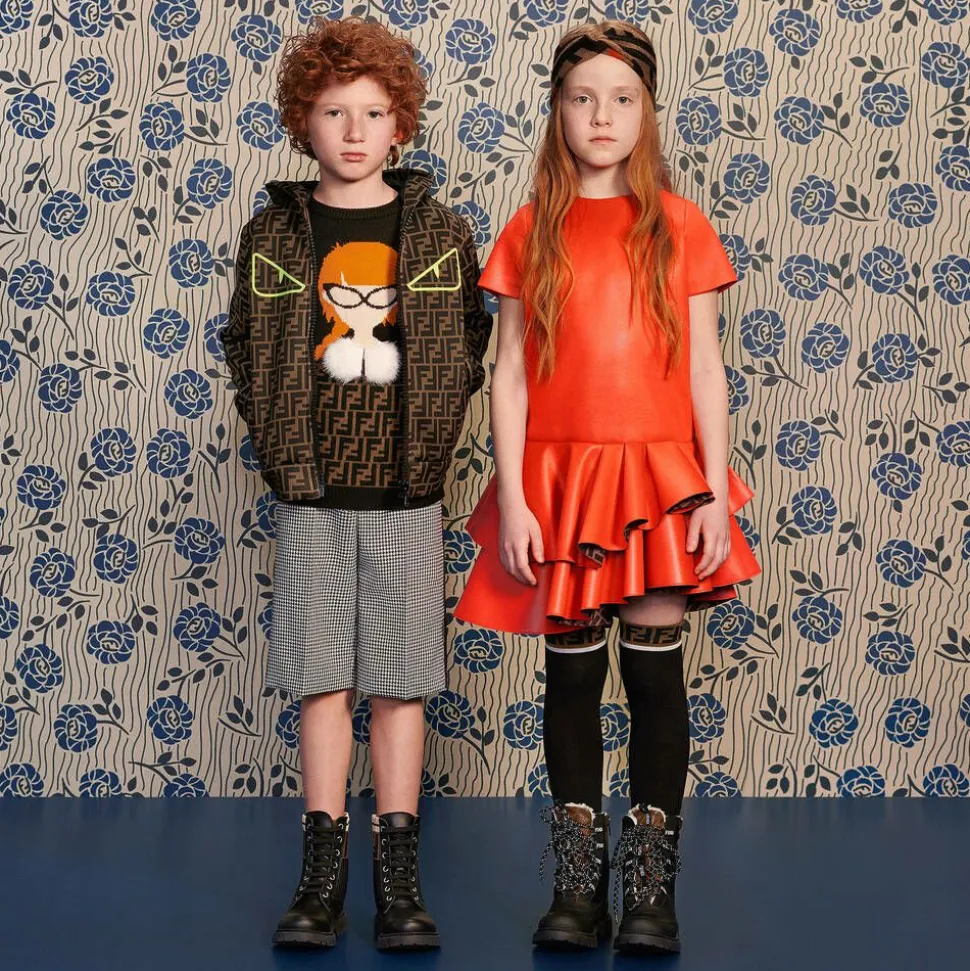 Stylish black lace-up boots for boys and girls by luxury Italian brand, Fendi. They are made in soft and supple leather with stretchy black and beige 'FF' logo socks above. Padded and lined in comfortable leather, these stylish boots have a ridged non-slip rubber sole.