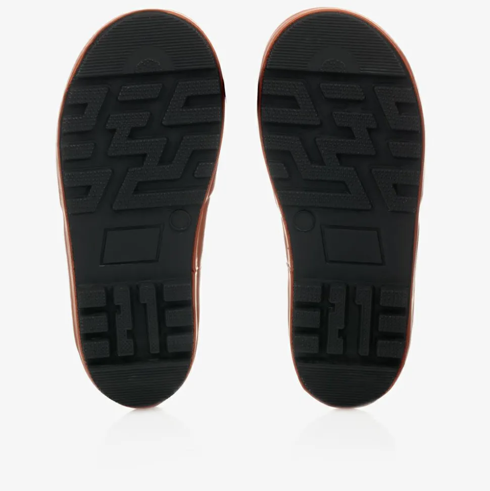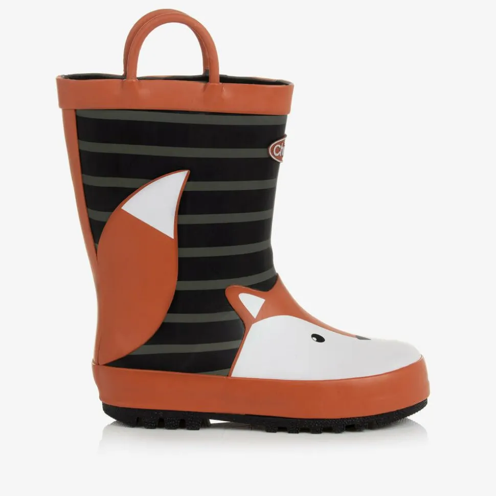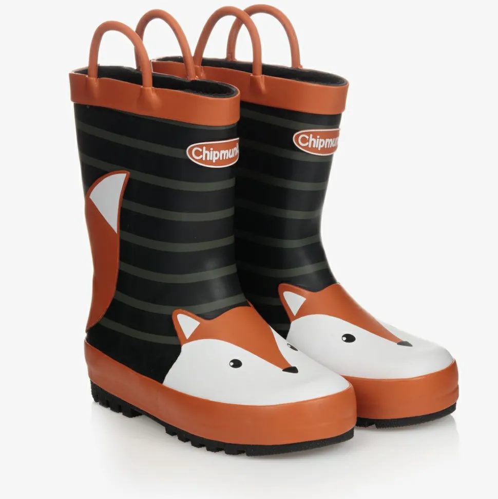 Cute black rubber waterproof rain boots for boys and girls by Chipmunks, with a fun rust orange and white fox face on the toe. These black and khaki green striped boots have a soft fabric lining, a chunky black sole and the smaller sizes have handles on the sides so they can be pulled on easily.