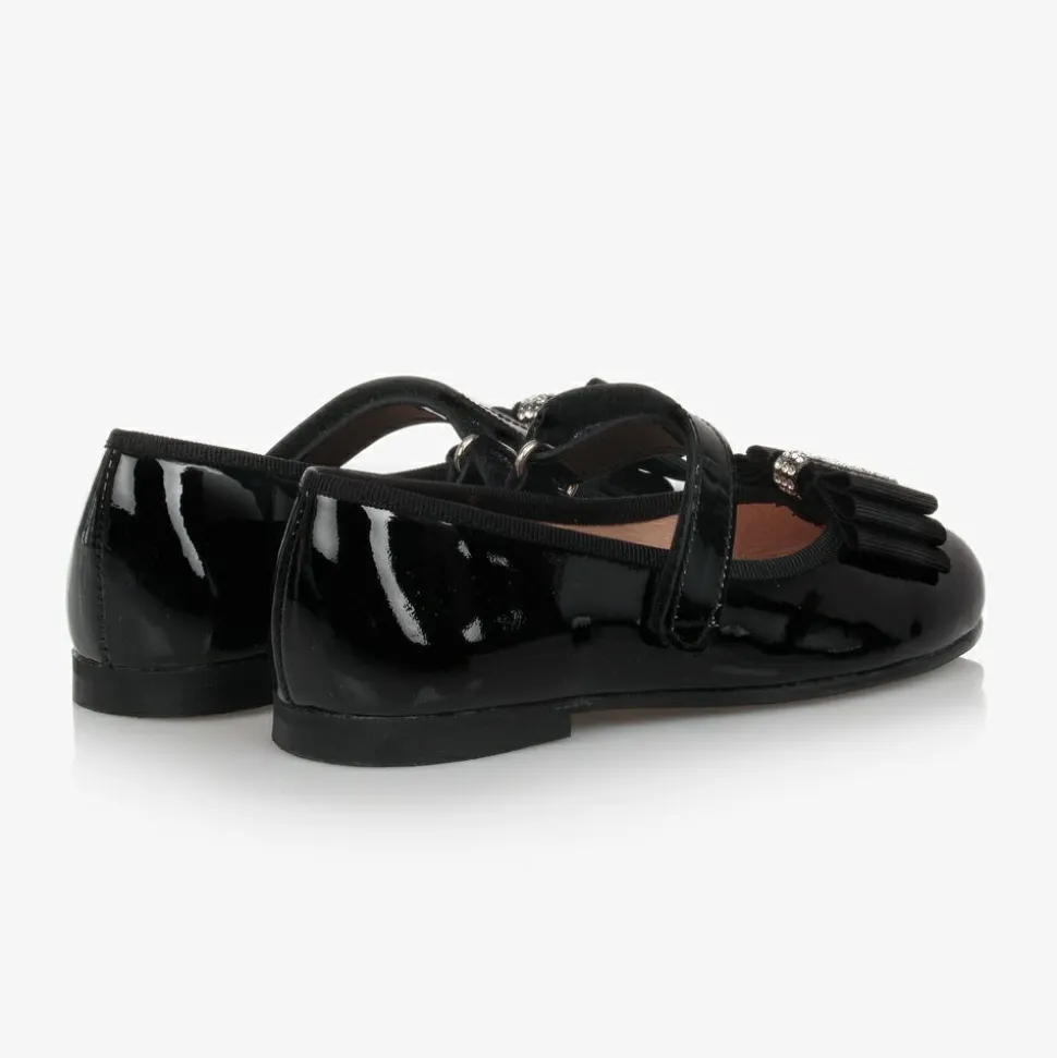 Exclusive to Childrensalon, a pair of black patent leather shoes for girls from Children's Classics. These pretty ballerina pumps have a grosgrain ribbon bow with diamanté across the toes. They fasten with a velcro strap and are fully lined in leather, with a non-slip sole.