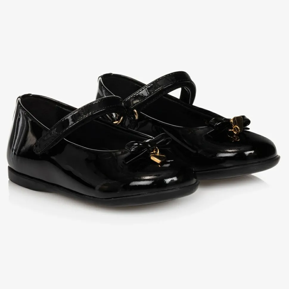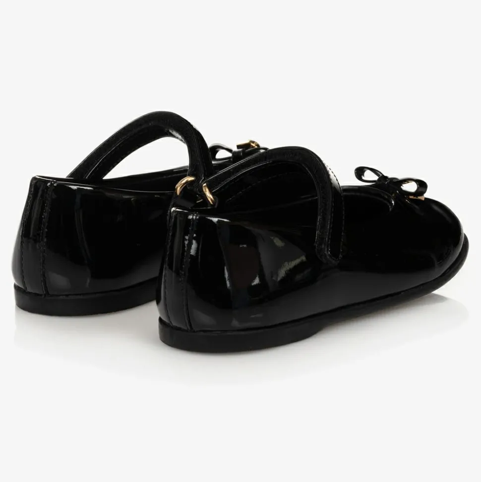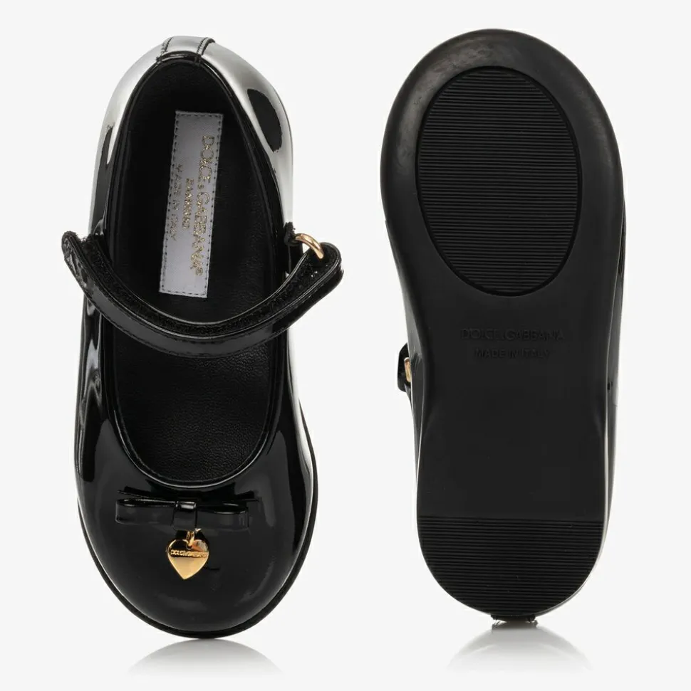 Girls black patent leather ballerina pumps from luxury designer Dolce & Gabbana. They have a gold logo embossed heart charm attached to a leather bow on the toes. They are lined in soft leather, with a leather insole and non-slip rubber sole. There is a velcro strap fastening over the foot.