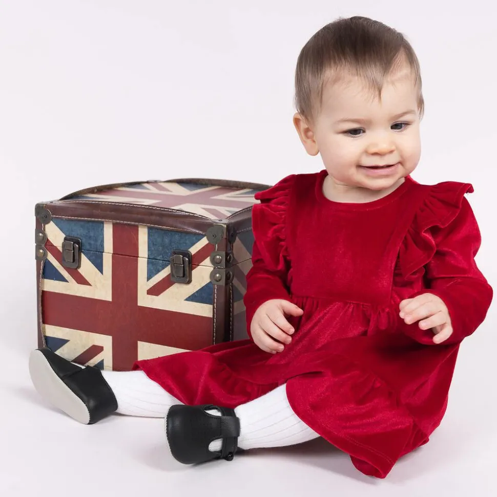 Black pre-walker shoes for little boys and girls by Early Days Baypods, made in soft faux leather with a dainty holed pattern on the toes. They have a flexible sole and a comfortable lightly padded insole, with a button fastening strap.