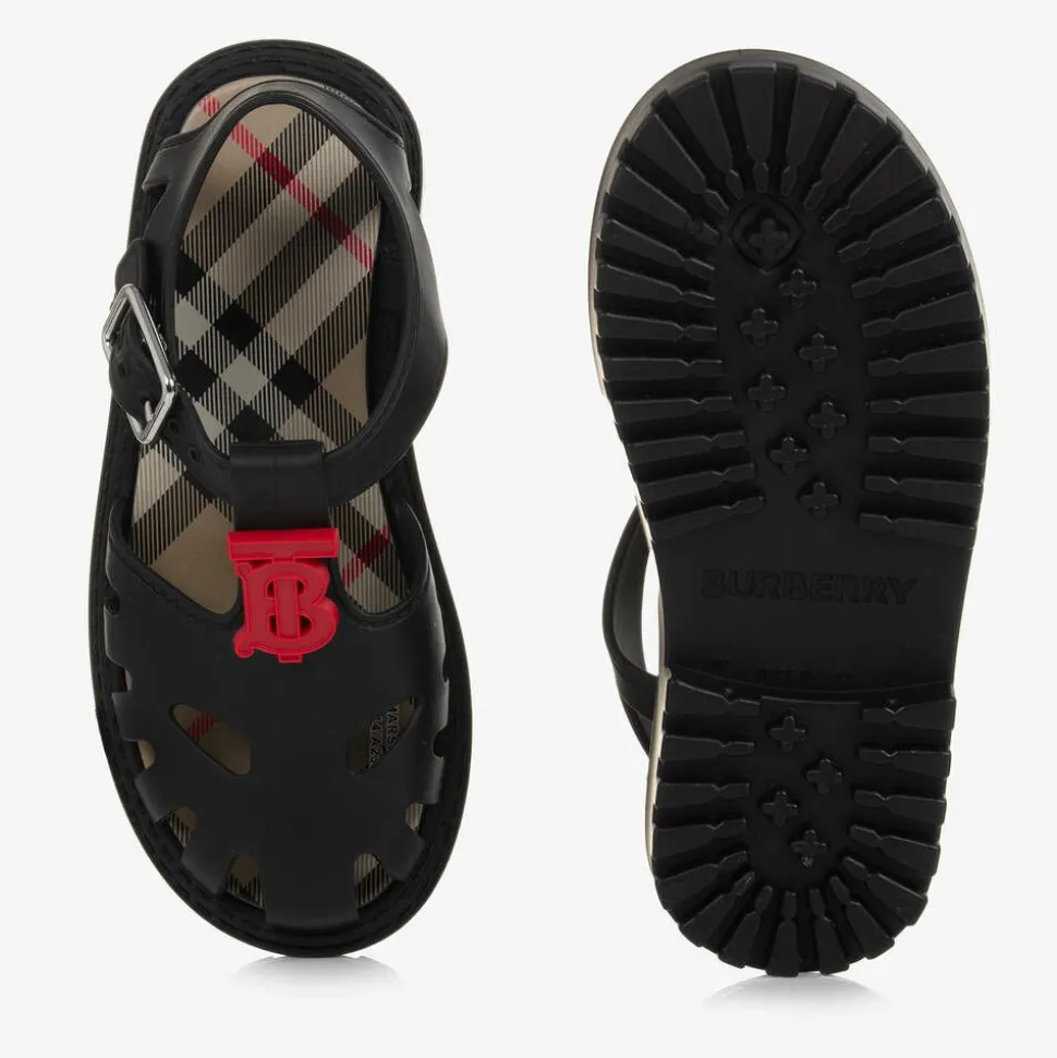Suitable for boys and girls, these black jelly shoes are by luxury British brand Burberry. The footbeds are printed with the iconic Vintage check, and there are signature red Thomas Burberry monograms on the front. Made from smooth and flexible rubber, these sandals have deep treads in the outsoles for extra grip and fasten with silver buckles for an adjustable fit.