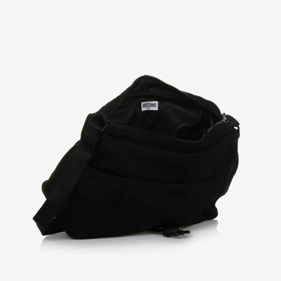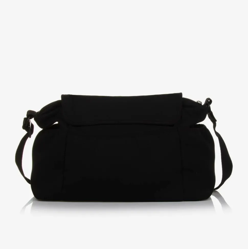 From Moschino Baby, black changing bag with a bold logo and Moschino Teddy Bear characters printed on the front. This soft cotton blend bag is lined with a smooth lining that can easily be wiped clean. Multiple drop pockets make for easy organisation and allow essentials to be located in a hurry, whilst the tonal zip and clip fastenings keep everything secure while in use. The adjustable strap has a jacquard logo and the changing mat is printed with a large white logo for instant recognition.