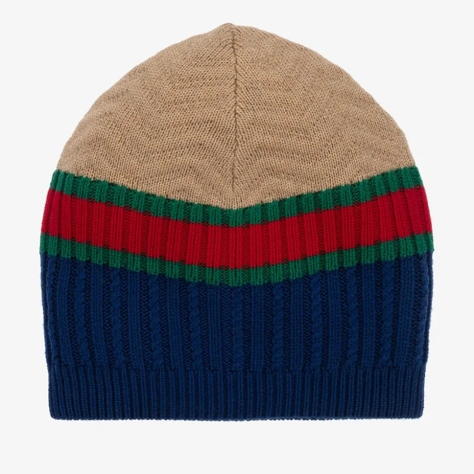 Luxuriously soft blue and beige knitted wool beanie hat for boys and girls from Italian label, Gucci. Beautifully crafted with zigzag, rib and cable patterns for a multi-textured finish, this cosy hat features the signature green and red Web stripes for a distinctive Gucci look.