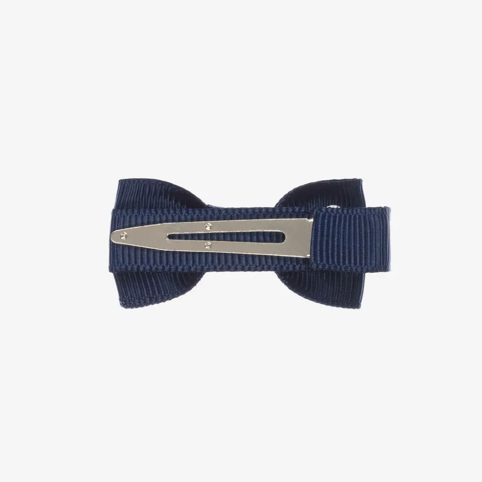 Girls navy blue handmade bow hair clip by Peach Ribbons. A finishing touch to an outfit, this sweet accessory is made in grosgrain ribbon and set on a metal clip.