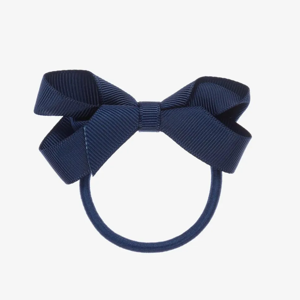 Girls classic hair elastic with a pretty navy blue grosgrain ribbon bow by Peach Ribbons.