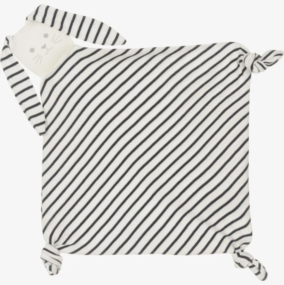Four-piece trouser set for baby boys and girls by classic French brand Petit Bateau, with navy blue and ivory Breton stripes. Beautifully comfortable, it is made in soft organic cotton jersey, with ribbed trims. The top has a cross-over front with a tie and popper fastening, and 'I Love You ♥' printed in red on one side. The white bodyvest has easy-to-use popper fastenings on the side and between the legs, whilst the pull-up trousers have a stretchy, elasticated waist. An adorable, matching rabbit dou dou with knotted corners completes the set.
