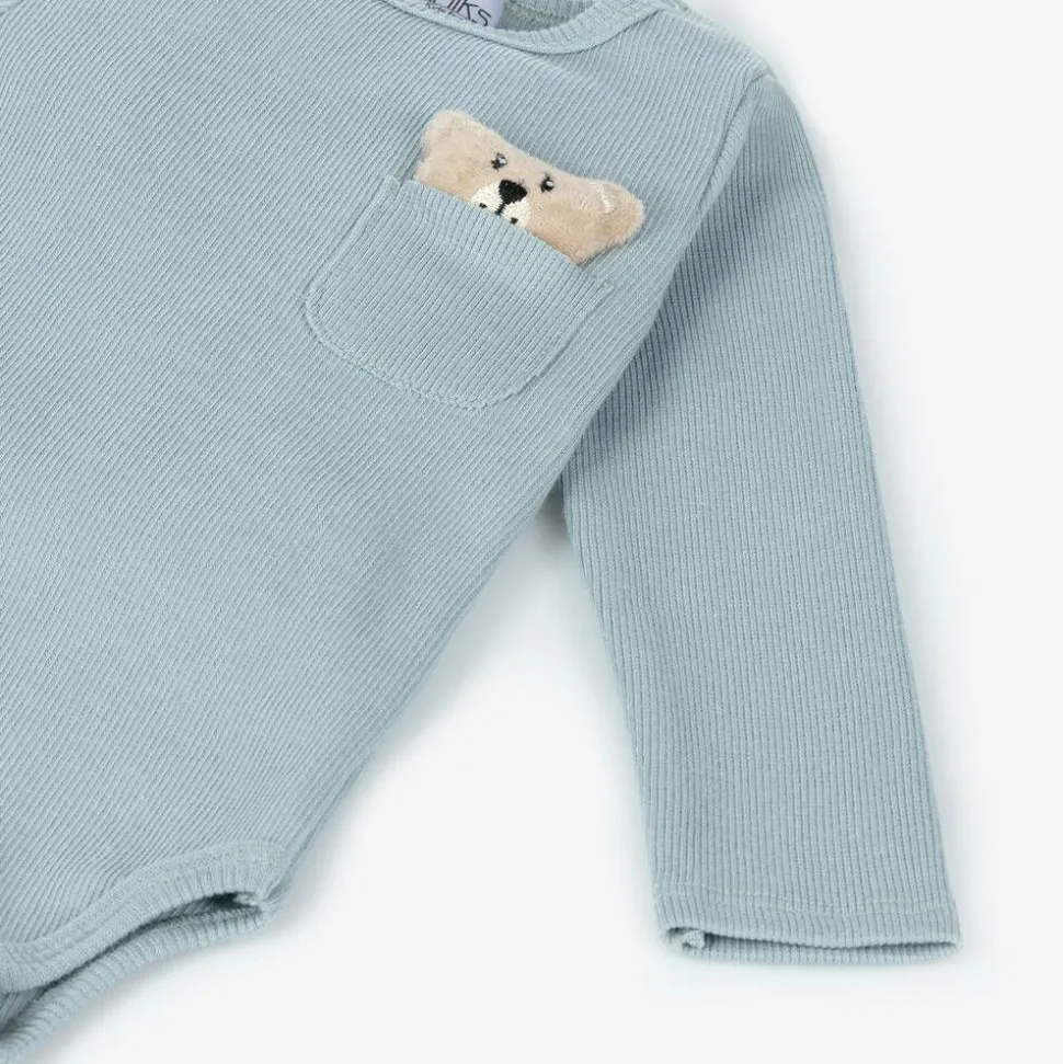 Blue trouser set for baby boys by Jamiks, made from softly ribbed cotton jersey. A comfortable, easy-to-wear style, the long-sleeved bodyvest fastens with poppers on one shoulder and between the legs for quick dressing. It has a chest patch pocket, with a cute 3D teddy bear peeping out the top. The matching trousers have a teddy bear patch stitched above one ankle and a gently elasticated waistband.