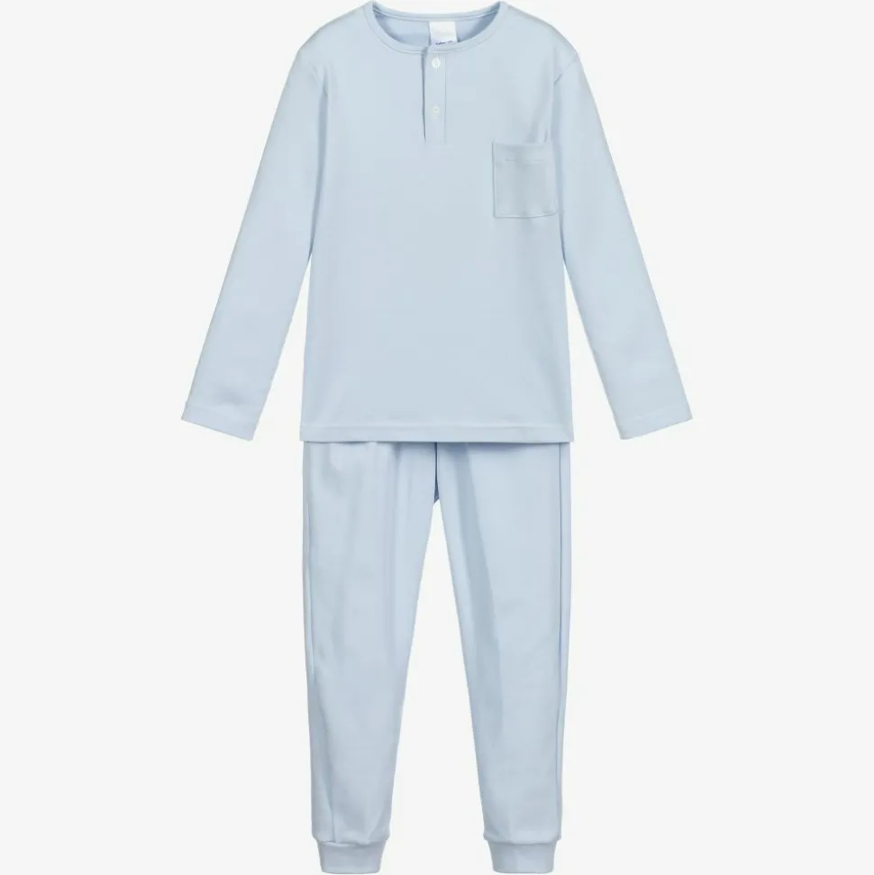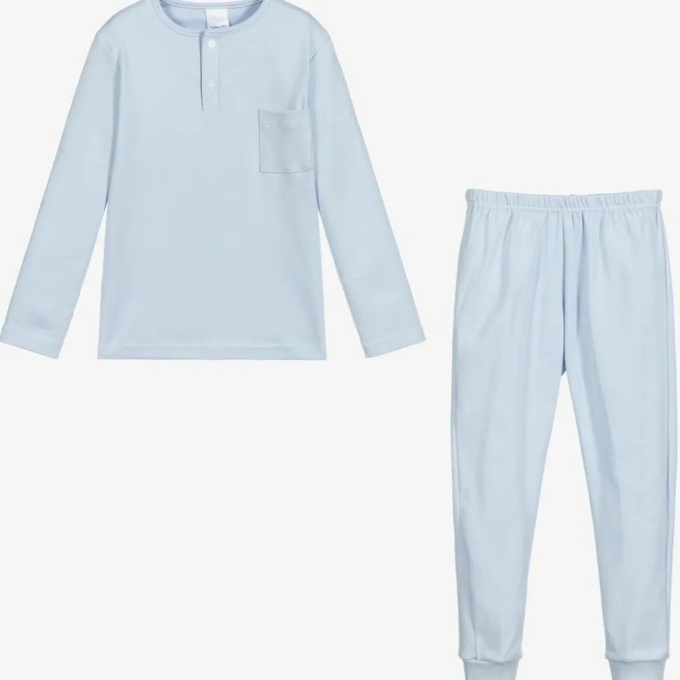 Exclusive to Childrensalon, pale blue pyjamas by Babidu, for boys. Made from super soft cotton jersey, the long sleeved top has button fastenings on the front, with a chest pocket. The matching bottoms are cuffed and they have an elasticated waistband for comfort.