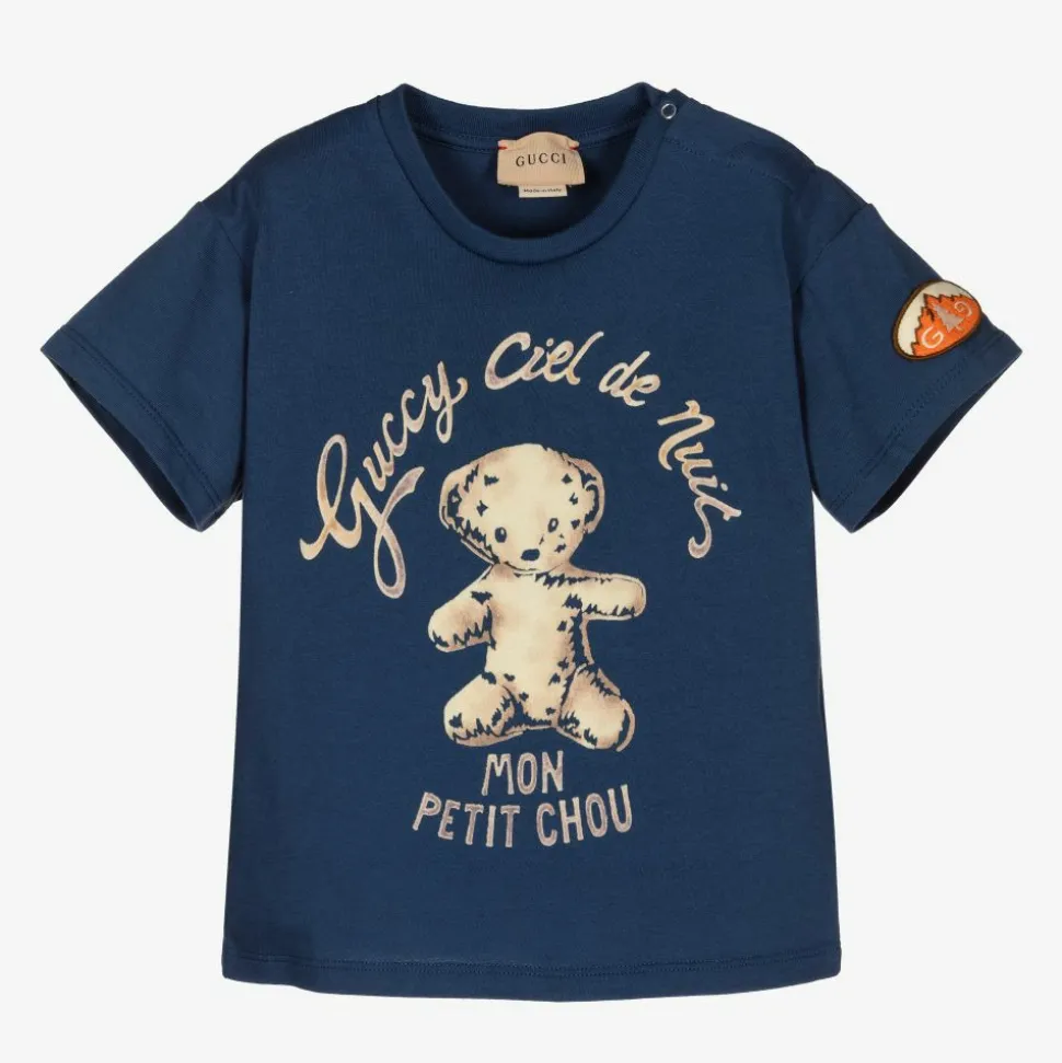 Blue oversized T-shirt for younger boys and girls by luxury Italian brand Gucci, made in soft cotton jersey. It has a beige flocked print on the front with the phrase 'Guccy ciel de nuit mon petit chou' and a teddy bear. The phrase references a nickname for the house, the night sky and a term of endearment. It has a logo patch on one sleeve and fastens with poppers on one shoulder.