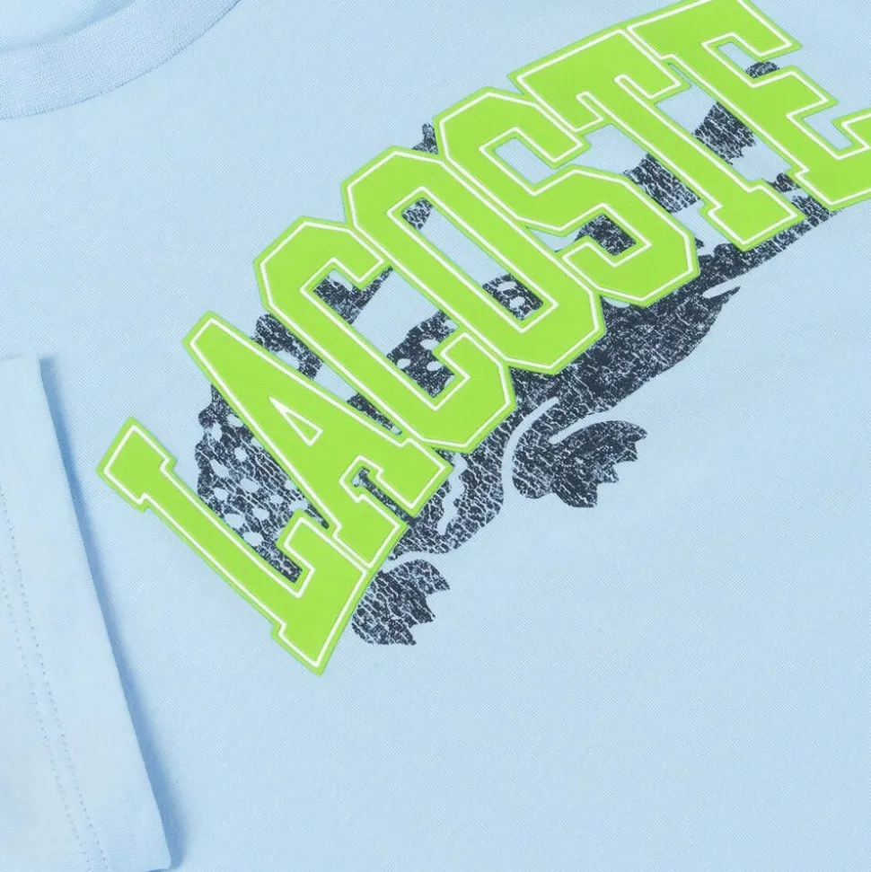Pale blue cotton T-shirt for boys and girls by unmistakably by Lacoste. It has a large, green, varsity-style logo emblazoned across the front, with the brand's reimagined crocodile logo in distressed navy blue below. Made in super soft jersey, the T-shirt has a crew neck and the iconic embroidered green crocodile logo badge by the hemline.