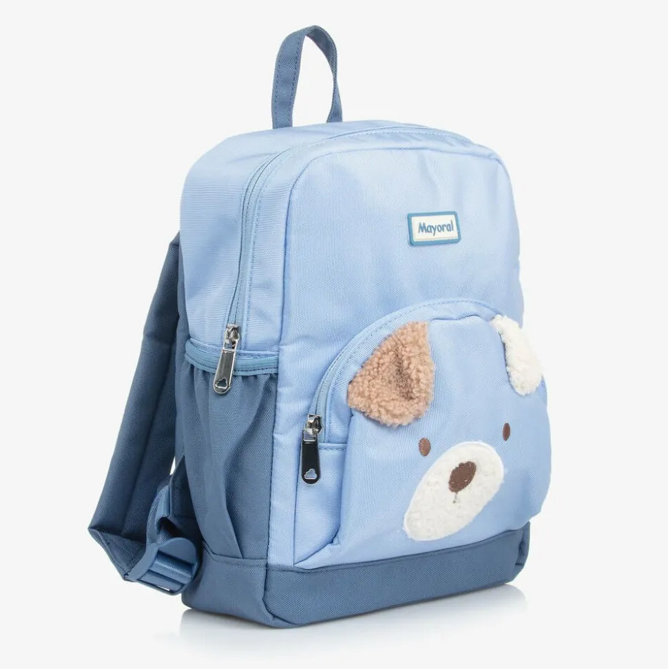 Cute blue backpack for boys and girls from Mayoral. This lovely bag is made of sturdy canvas with two zip-fastening compartments. The shoulder straps are lightly padded and adjustable for comfortable wear. The front pocket is finished with an adorable dog face.