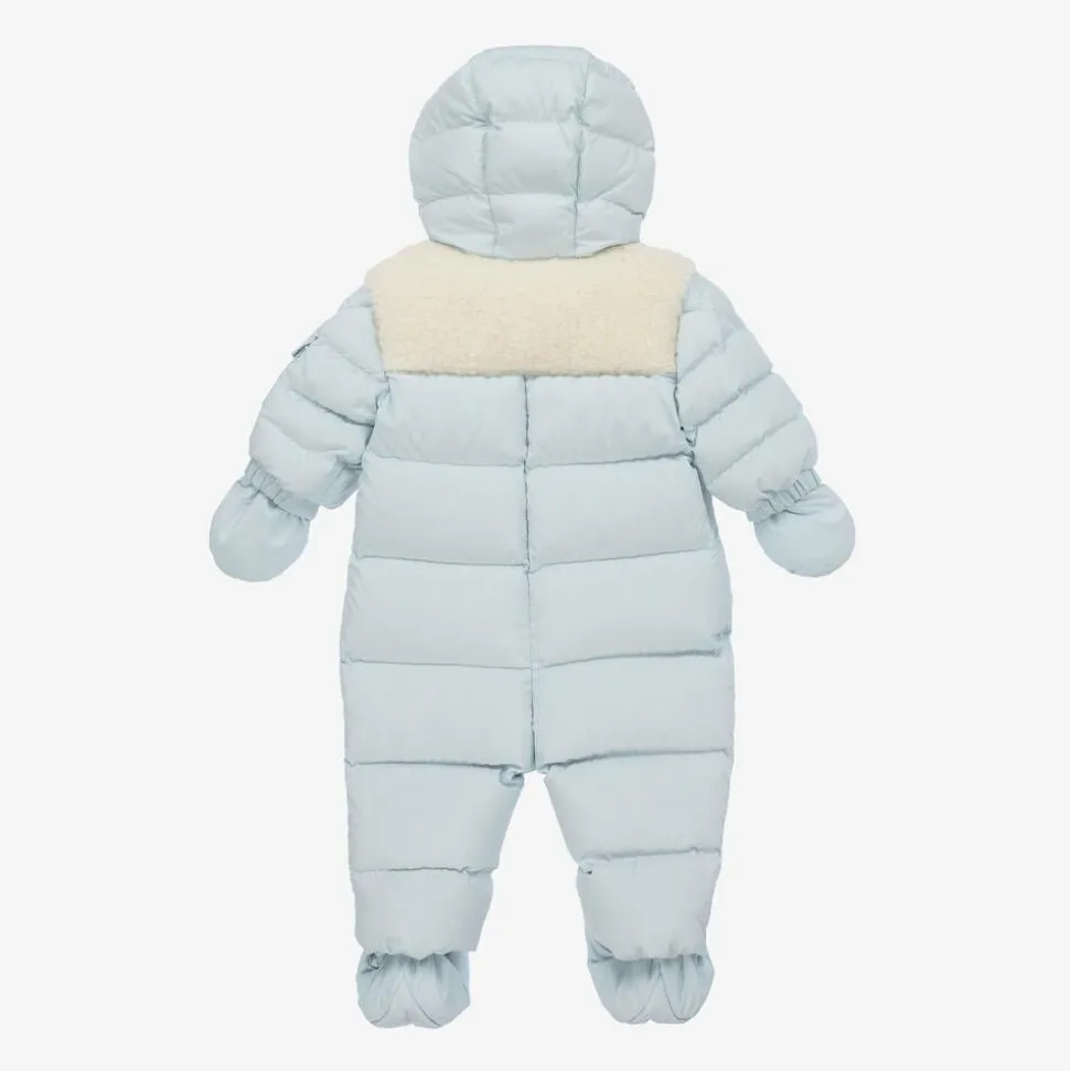 Pale blue hooded snowsuit for baby boys and girls by luxury brand Moncler Enfant, made with recycled materials. Silky smooth, it is made in a matte fabric that is both water repellent and breathable and has a beautifully soft cotton jersey lining. It is down-padded for superior warmth and comfort and fastens with a branded zip fastening on the front. The detachable mittens and booties easily attach with poppers. Soft, ivory teddy fleece across the shoulders adds a stylish touch. One sleeve has a patch pocket, accented with a branded popper and the instantly recognisable felt logo patch.