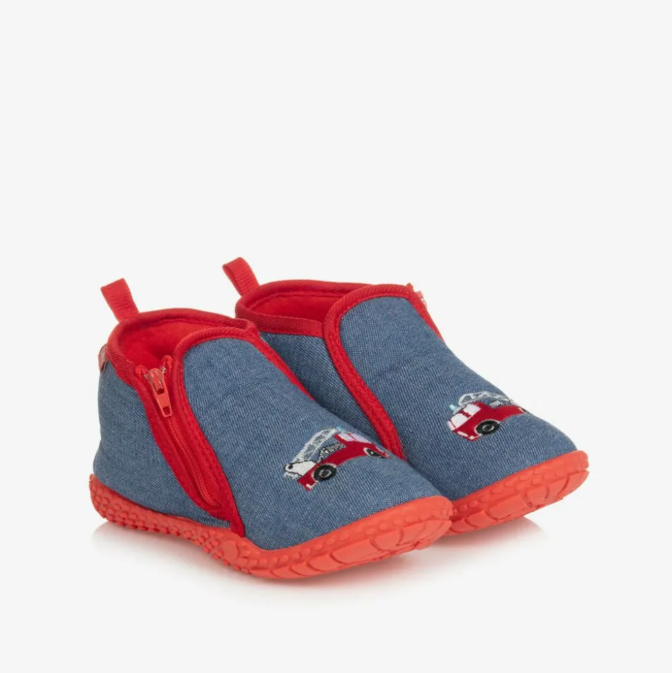 Boys blue and red slippers by Playshoes, with embroidered red fire engines on the toes. They have denim fabric uppers and a soft felted lining. There are zips to fasten on the sides and they have flexible, slip-resistant soles.