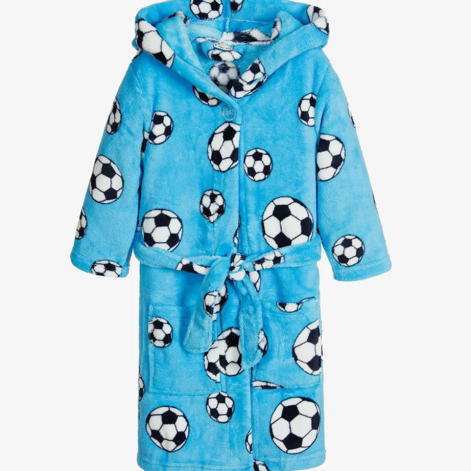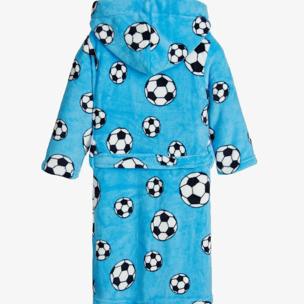 Bright blue dressing gown for little boys by Playshoes. With a fun navy blue and white football design, this cosy robe has a hood for added warmth. There are two useful pockets on the front, and it fastens with one button and a tie belt around the waist.