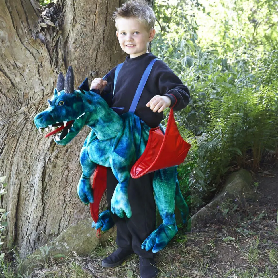 Blue and green dragon costume, by Dress Up by Design, with shiny red wings for both boys and girls. This fun dressing-up outfit has adjustable shoulder straps and a central body cavity, which the child can either step in, or wrap around with a velcro fastening. It has a large scaly neck and tail, the wings can be held out with wrist loops and there are reins to hold the growling head up.