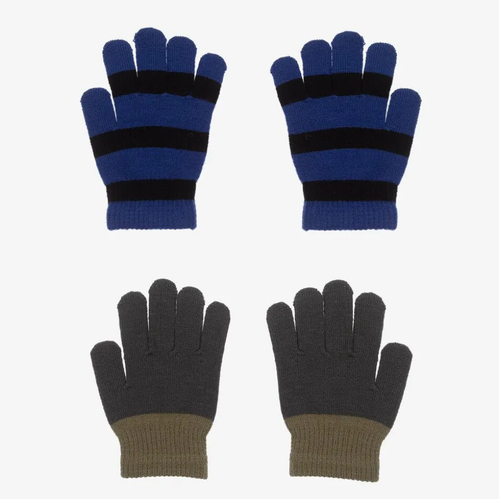 In a useful pack of two, these gloves for boys and girls are by Molo. One pair has blue and black stripes and the other has a colourblock design in different shades of khaki green. Made from a soft knit, they are ideal for keeping hands warm in colder temperatures.