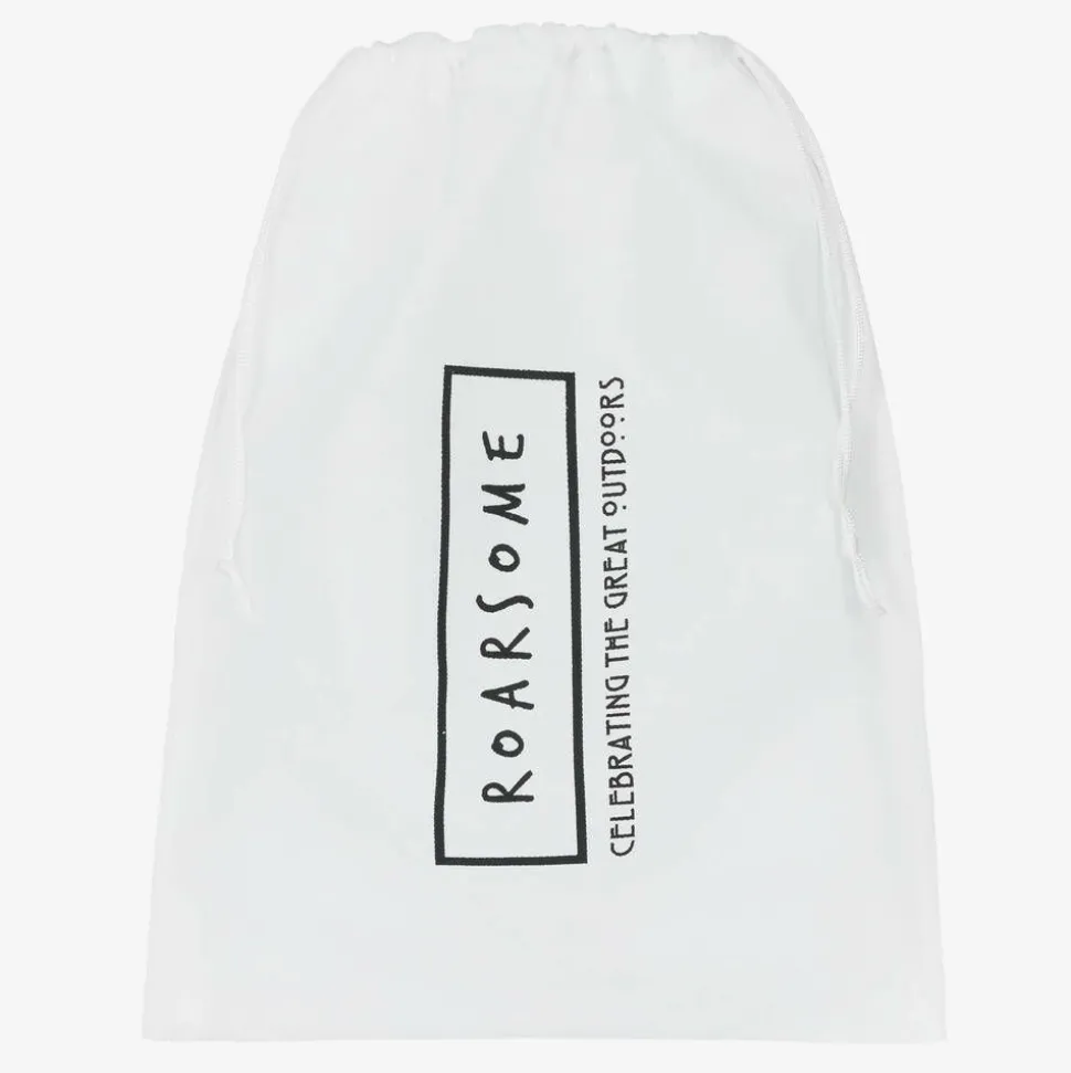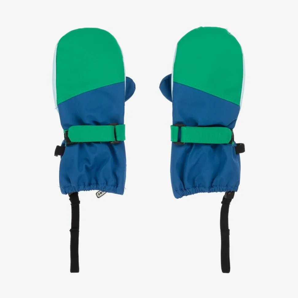 Bright blue and green ski mittens for boys and girls by Roarsome, made using recycled materials. These lightweight padded mittens are waterproof and warm. The palms are slip-resistant for good grip and they can be secured tightly with a velcro strap.
