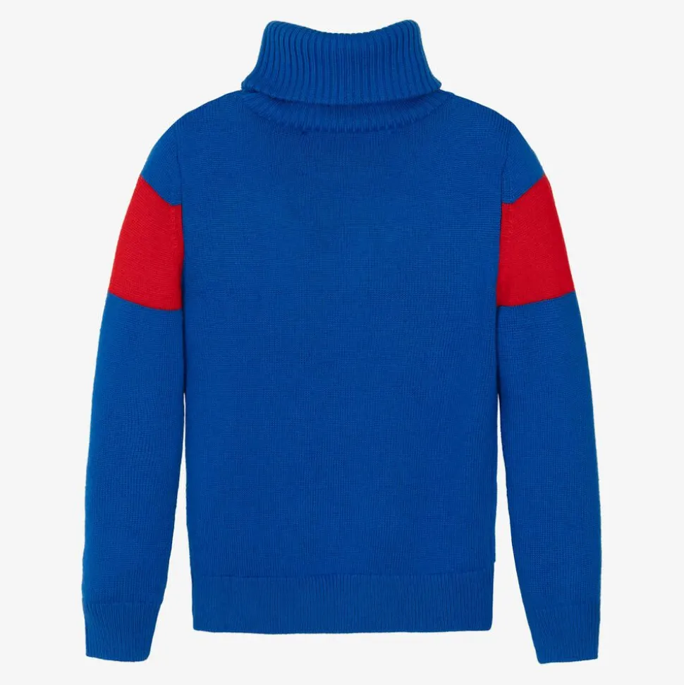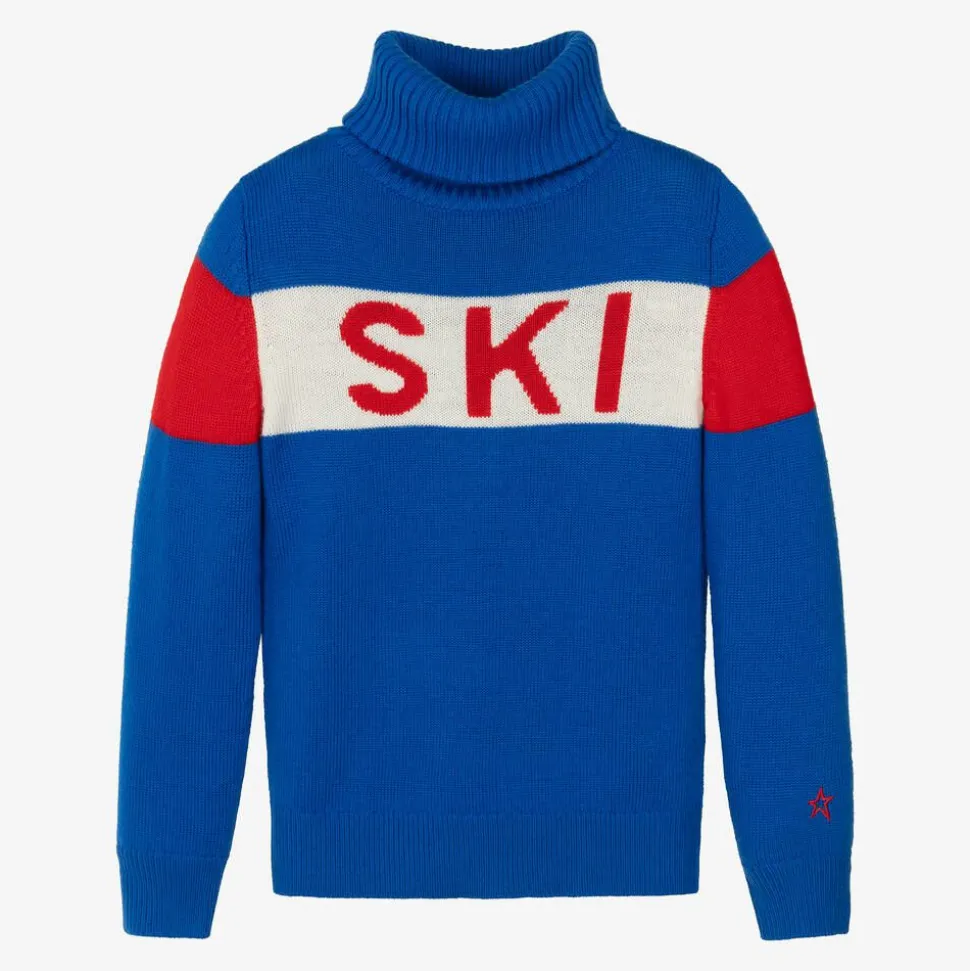 Blue roll neck sweater for boys and girls by Perfect Moment, with an aprés-ski-inspired style. Knitted in soft, extra fine Merino wool, it has an intarsia 'Ski' panel across the front and colourblock stripes on the sleeves. The brand's signature red star is embroidered above the cuff for a designer finishing touch.