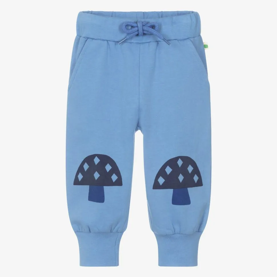 Casual blue joggers for baby boys and girls by British brand the bonniemob, with navy blue mushroom prints on the knees. Soft and comfortable to wear, they are made in organic cotton jersey with a cosy fleece feel inside. The stretchy waistband can be adjusted with a drawstring and there a slanted front pockets.