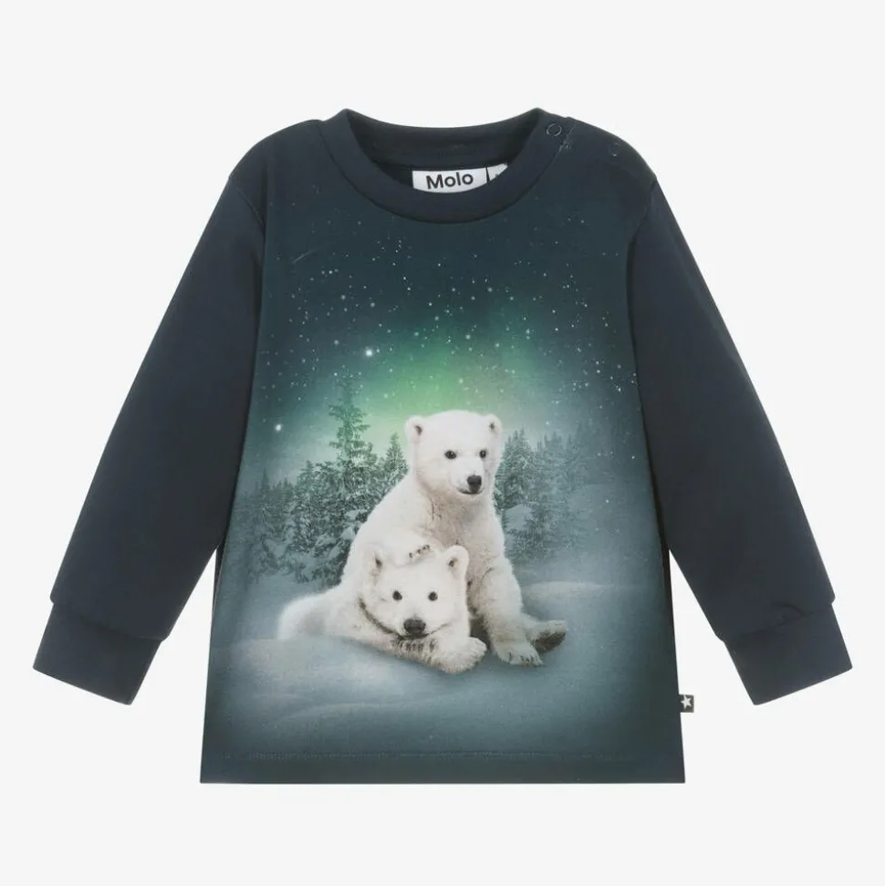 Navy blue top for little boys and girls by Danish brand Molo, with adorable polar bear cubs on the front. Casual and comfortable, it is made in soft organic cotton jersey, with a gently ribbed neckline and cuffs. There are easy-fastening poppers on one shoulder to help with dressing. A small logo tab on the side seam adds a finishing designer touch.
