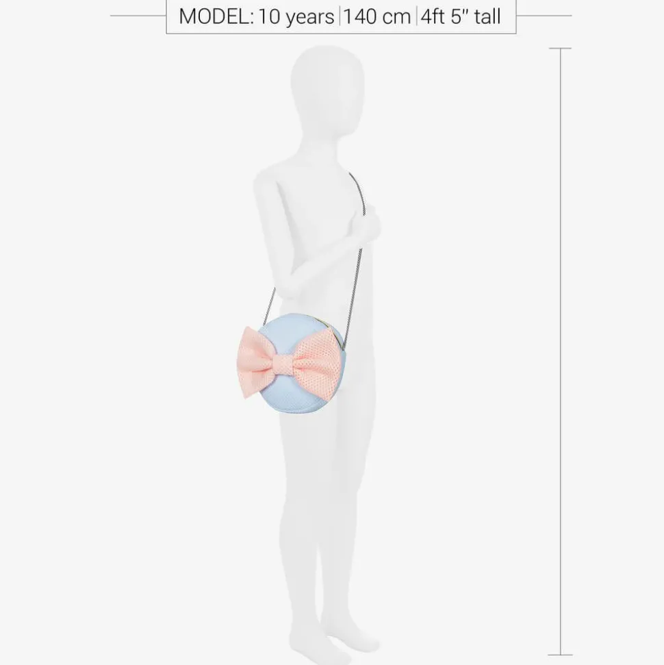 Pale blue and pink round bag for girls from Wauw Capow by Bangbang. It is made with soft polyester offcuts in an embossed, mesh-style design, with a large pink mesh bow. There is a large zipped compartment, a lightweight voile lining, and a black and white striped shoulder strap.
