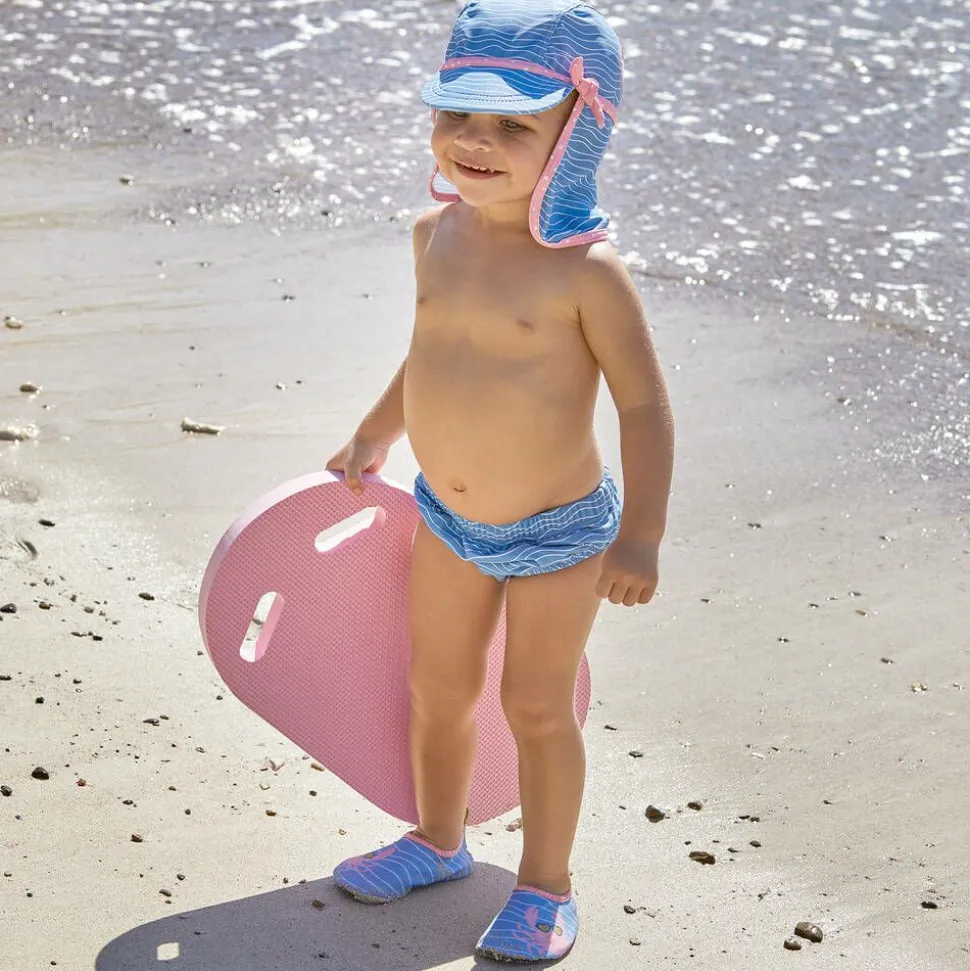 Girls blue and pink aqua shoes by Playshoes, with a fun crab design. Made in stretchy, quick drying fabric, they have flexible, slip resistant soles and are easy to pull on.