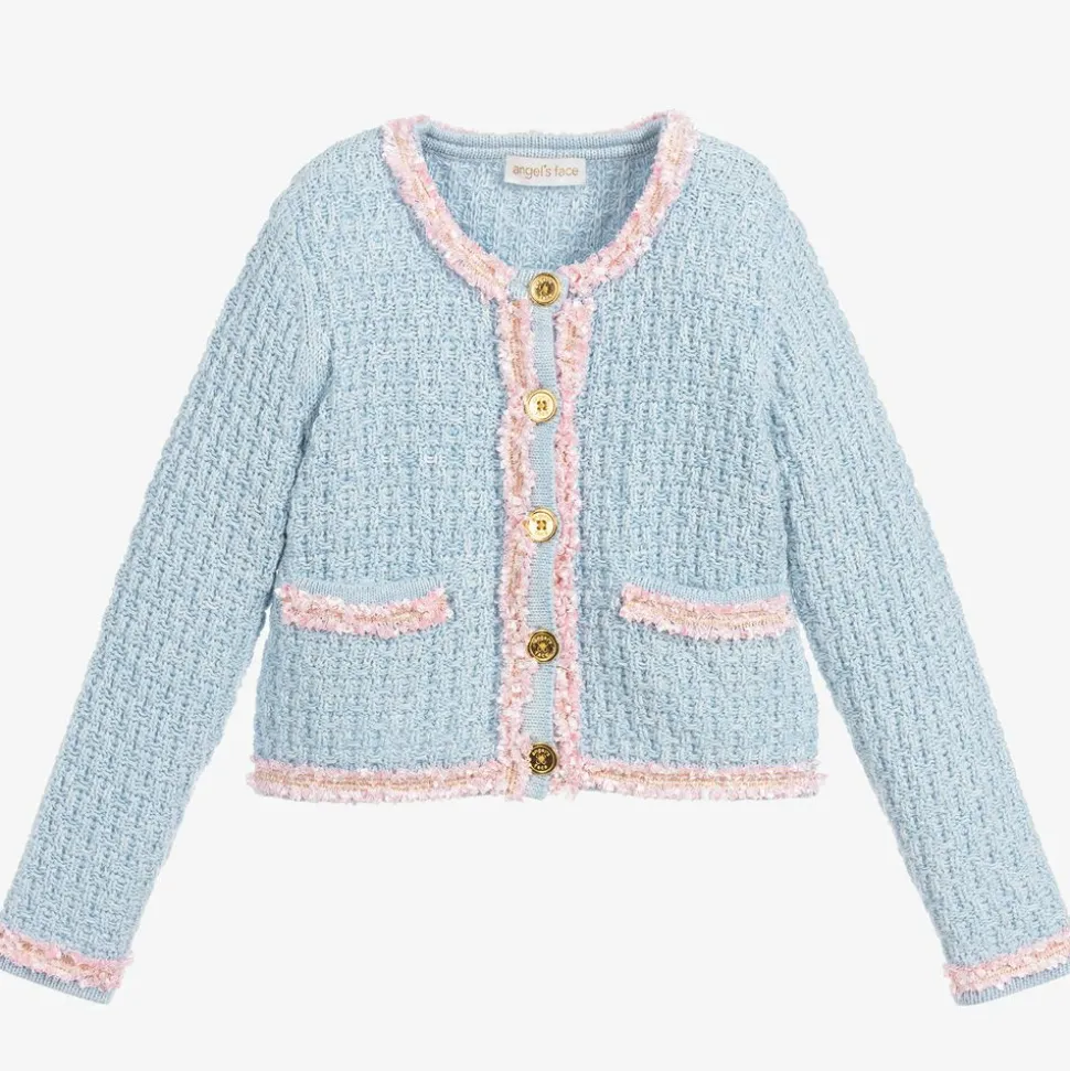 Knitted in soft cotton, this elegant pale blue jacket is by Angel's Face. It has shiny, frilly pink trims with gold stitching around the neckline, pockets and down the front. It fastens with shiny gold logo buttons.