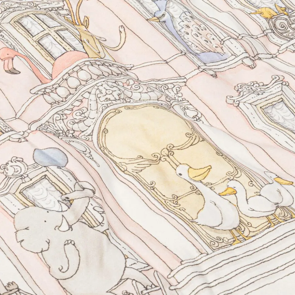 A reversible duvet for little boys and girls from Atelier Choux Paris, made from gentle organic cotton with mid-weight, anti-allergenic padding. Lovely for a little one moving to a bigger bed, this beautiful Parisian-inspired quilt features a Monceau Mansion print on one side and a sweet carousel illustration on the other in soft hues of pink and yellow.