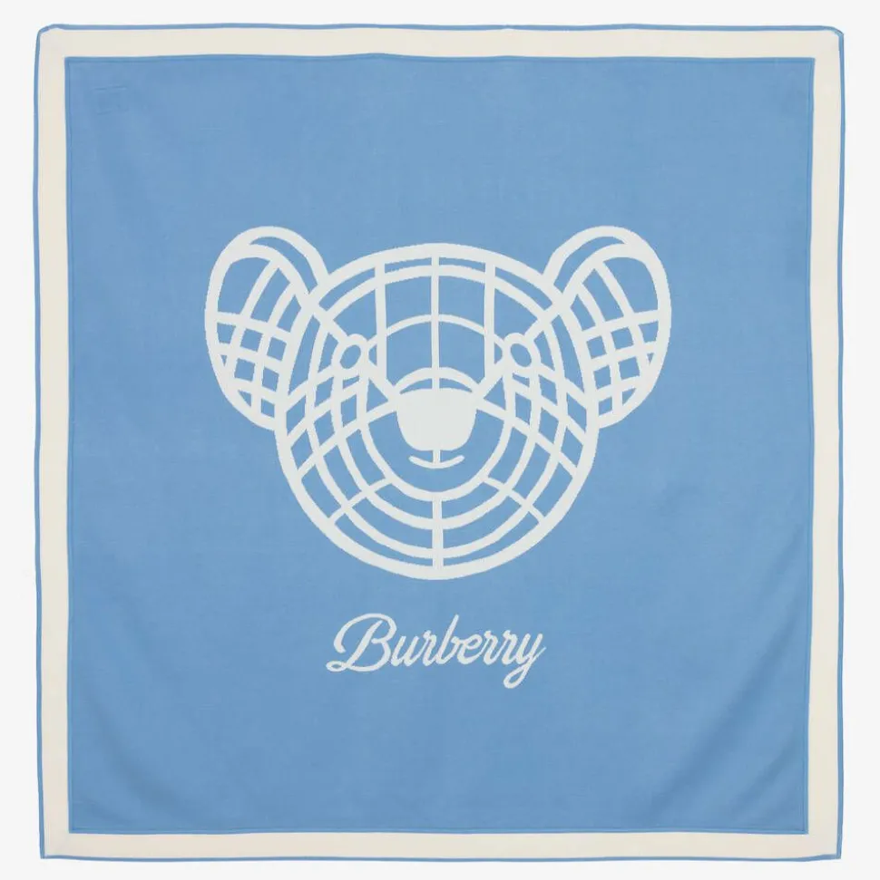 Gorgeously soft blue and ivory cotton knit blanket for baby boys from luxury British brand Burberry. The different side mirror one another, and feature the designer's adorable Thomas Bear mascot with logo lettering beneath.