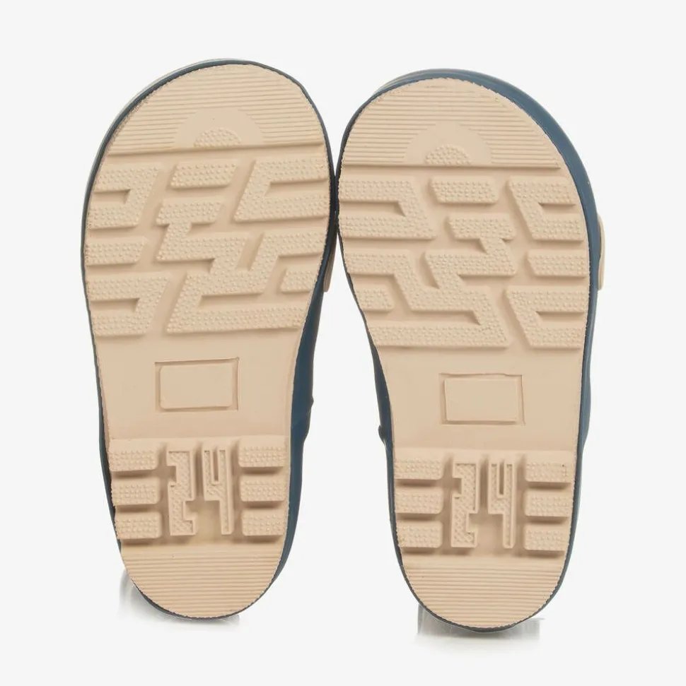 Deep blue and beige rain boots for boys and girls by Chipmunks, made in smooth, flexible rubber. With a cosy fleece lining to warm little feet, these adorable boots have a friendly walrus featured on the front. Smaller sizes have useful handles to help pull them on easily.