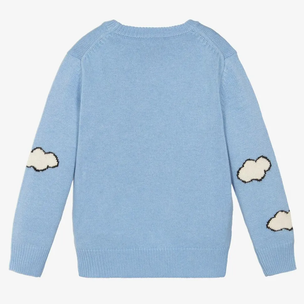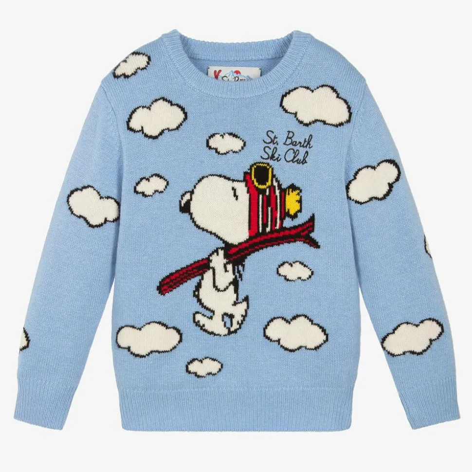 Cute pale blue sweater for boys and girls by by MC2 St Barth, made in a soft wool and cashmere blend. Peanuts character Snoopy is on the front, dressed for skiing and surrounded by clouds. 'St Barth Ski Club' is embroidered on one side for instant designer appeal.