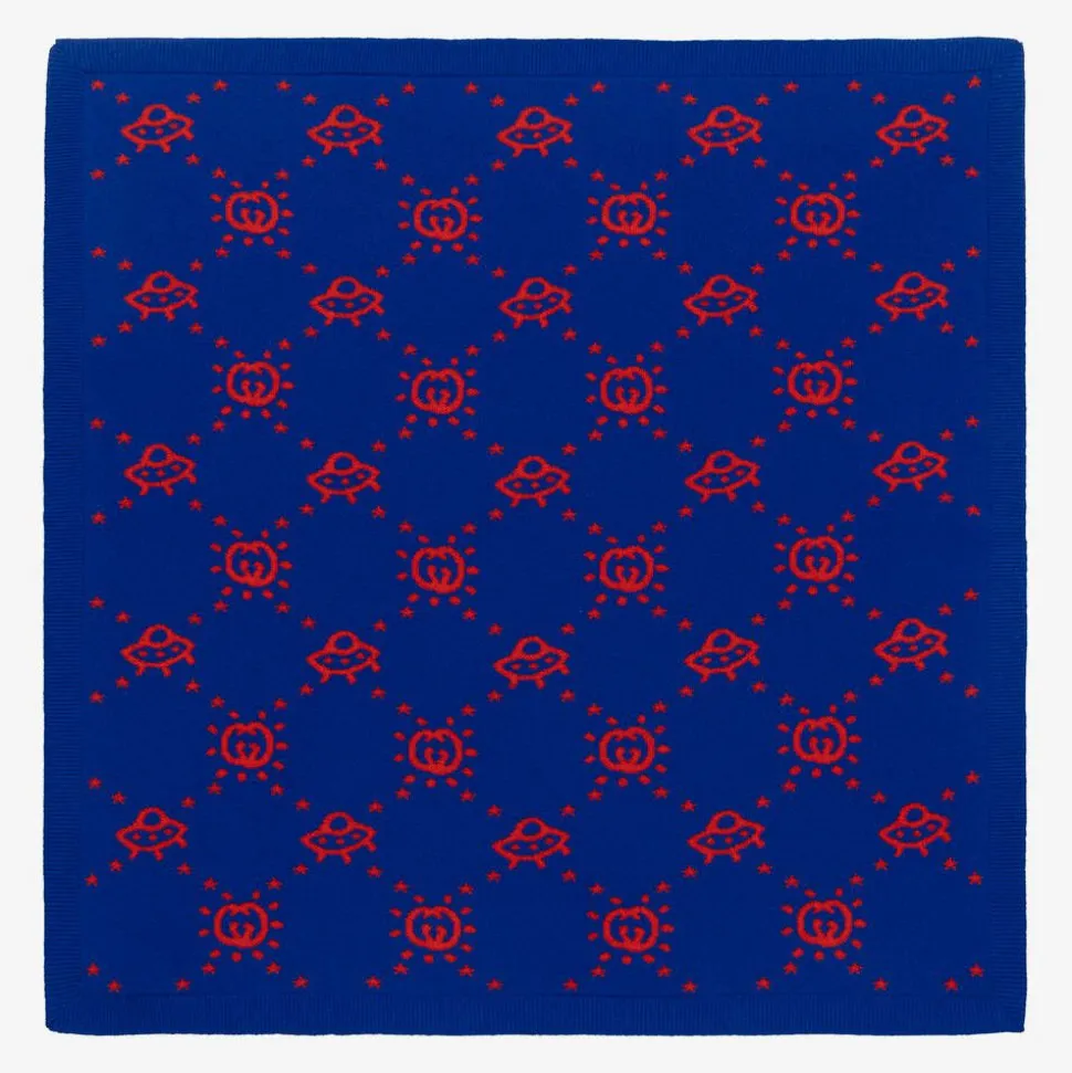 Royal blue and red knitted blanket for baby boys from Italian label, Gucci. Made in luxuriously soft wool with a ribbed trim, it is patterned with an Interlocking G and UFO design for a distinctive branded look. Stylishly cosy, this super soft and versatile accessory is ideal for use in the nursery or when out and about in the car seat or stroller.